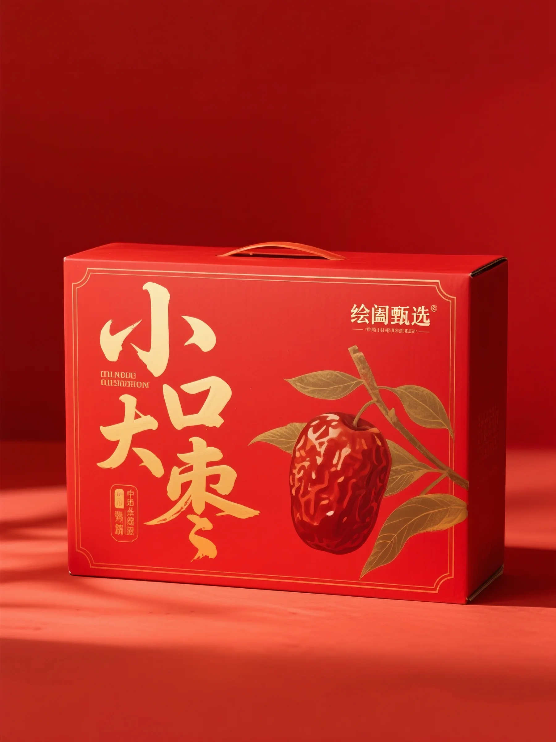 整体风格:以红色为主调,融合传统书法与大枣插画,营造喜庆典雅的中国风,适配节日礼品场景,传递浓厚文化底蕴。