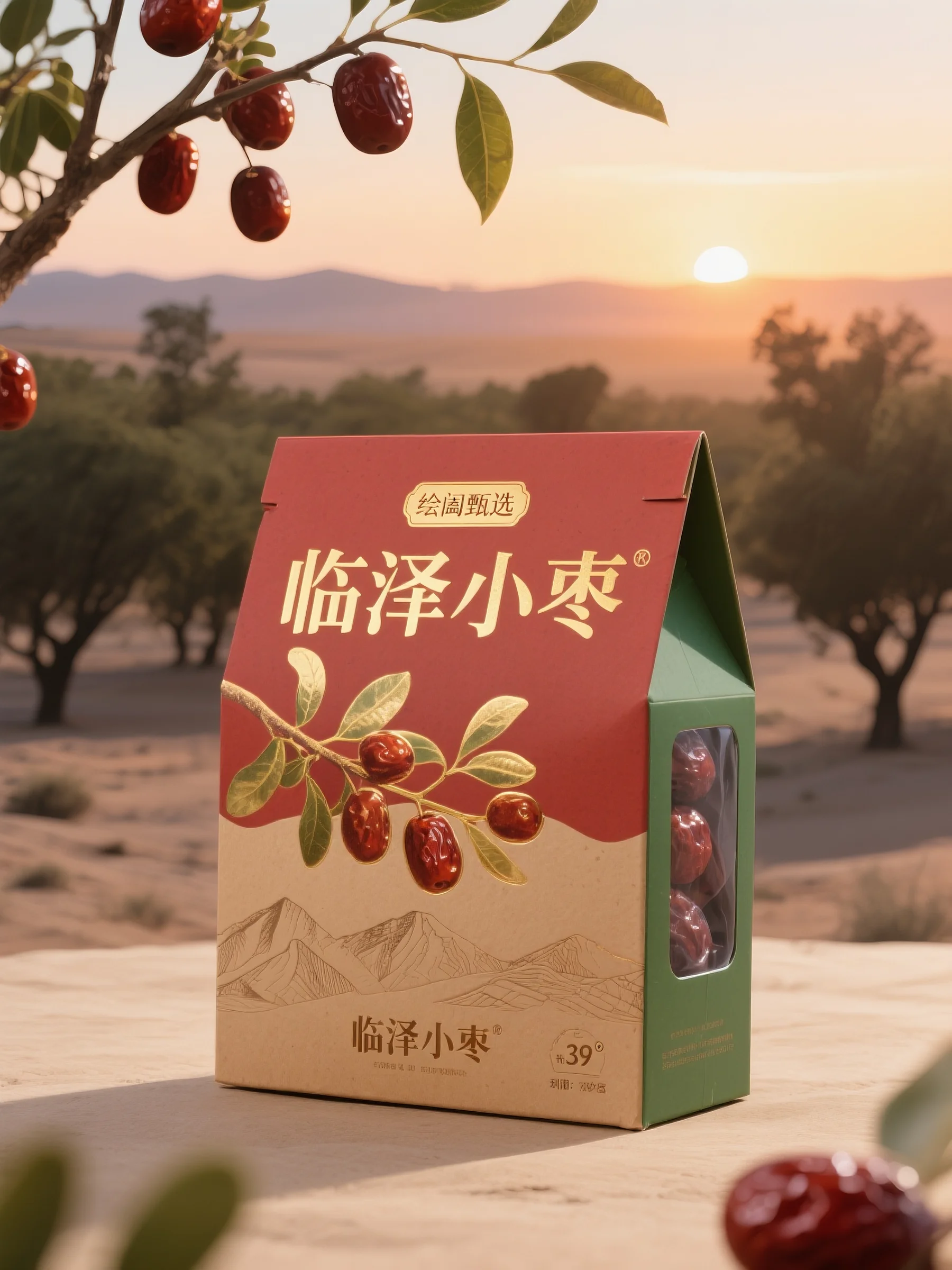 整体风格:融合地域文化与自然元素,以古朴典雅的设计展现临泽小枣的原生态品质,传递浓厚的乡土与文化底蕴,适配礼品与日常消费场景。