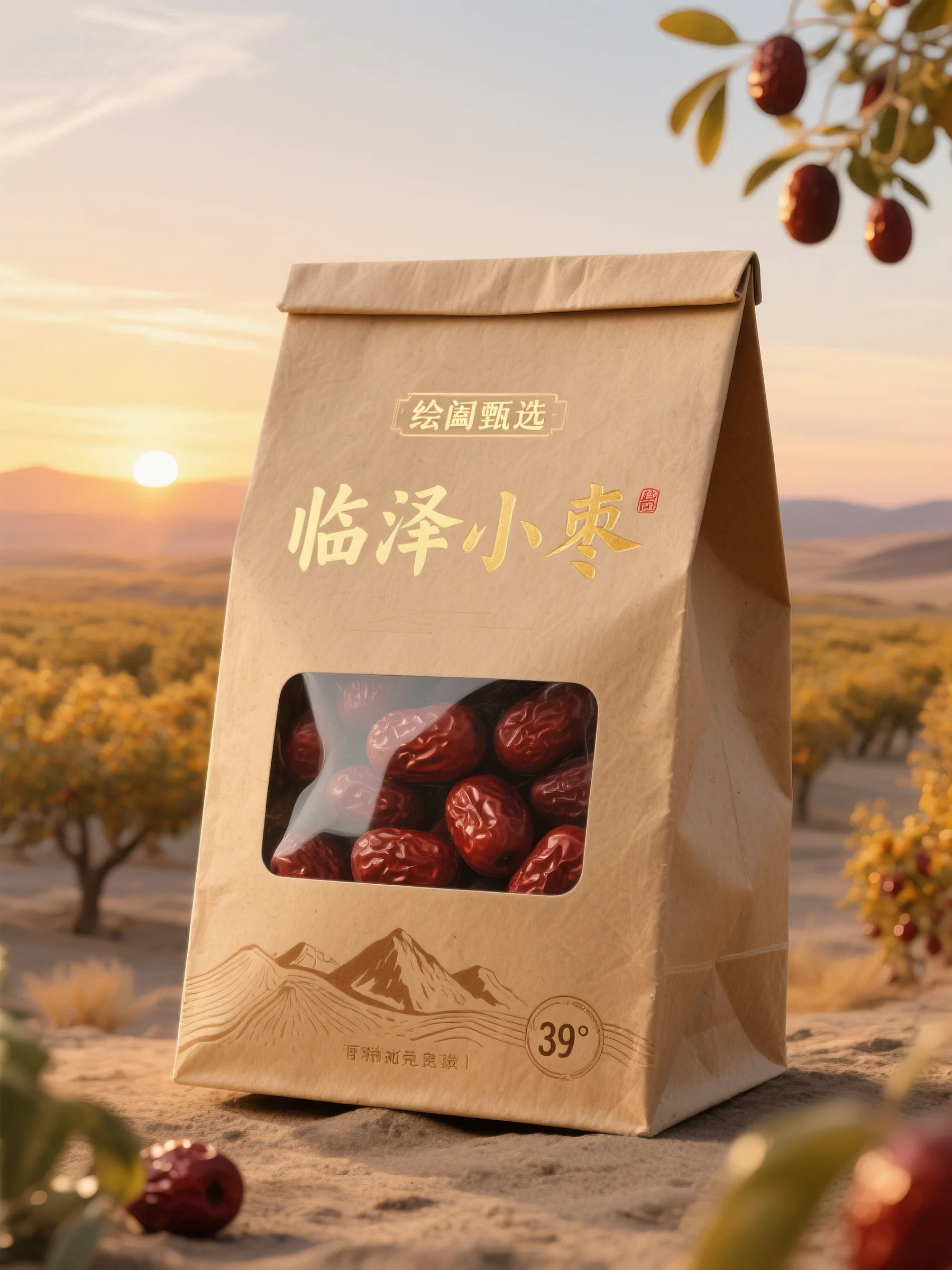 整体风格:自然质朴与地域特色融合,以临泽枣乡风光为背景,牛皮纸包装显原生态,传递甄选品质与自然风味。