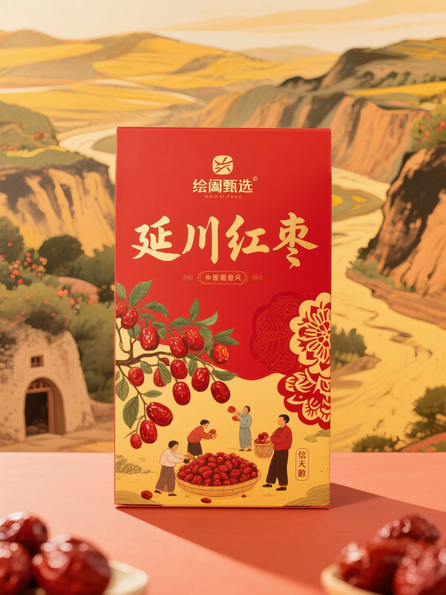 整体风格:传统民俗与地域文化融合,红金配色显喜庆质朴,适配礼品场景,传递乡土人文气息。包装形式:长方体纸盒,结构简洁,正面插画文字结合,视觉聚焦,提升展示效果与第一印象。色彩运用:红色主调象征吉祥丰收,金色增华贵,自然色调呼应延川风貌,层次丰富,突出天然品质。图案设计:红枣枝与丰收场景插画,融入剪纸元素,展现生长环境与丰收,强化地域文化,增强情感共鸣。文字信息:品牌、产品名醒目,“中经甄选”“信天歌”传递品质与文化,提升辨识度与消费者信任。