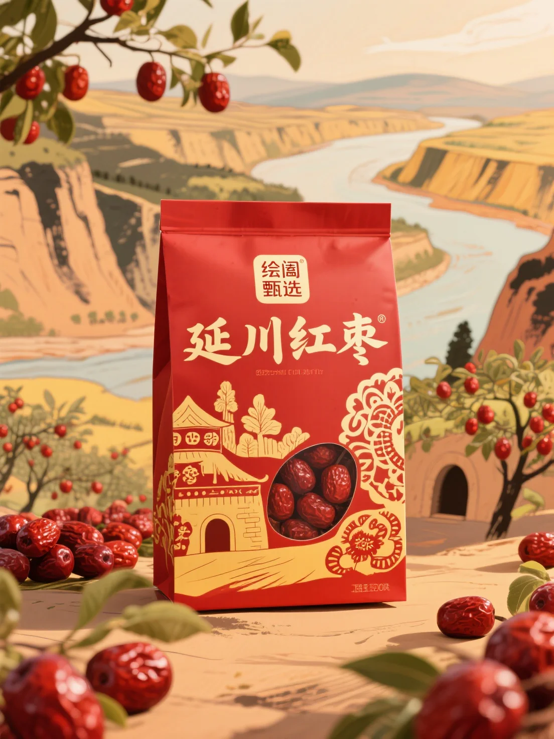 整体风格:融合延川地域风光与传统民俗文化,营造古朴自然、富有乡土气息的氛围,传递产品原生态与文化底蕴。包装形式:自立袋设计,便携易存且开窗展示红枣,增强直观性与吸引力,适配多场景消费。色彩运用:以红色为主调,搭配黄、白装饰,象征喜庆与天然色泽,形成鲜明对比,凸显传统美学韵味。图案设计:左侧手绘特色建筑,右侧融入剪纸元素,中间开窗呈现红枣,多维展现产地风貌与产品形态,强化地域文化关联。文字信息:品牌与产品名醒目,辅以地域文化暗示,传递甄选品质与特色,提升消费者认知与信任。