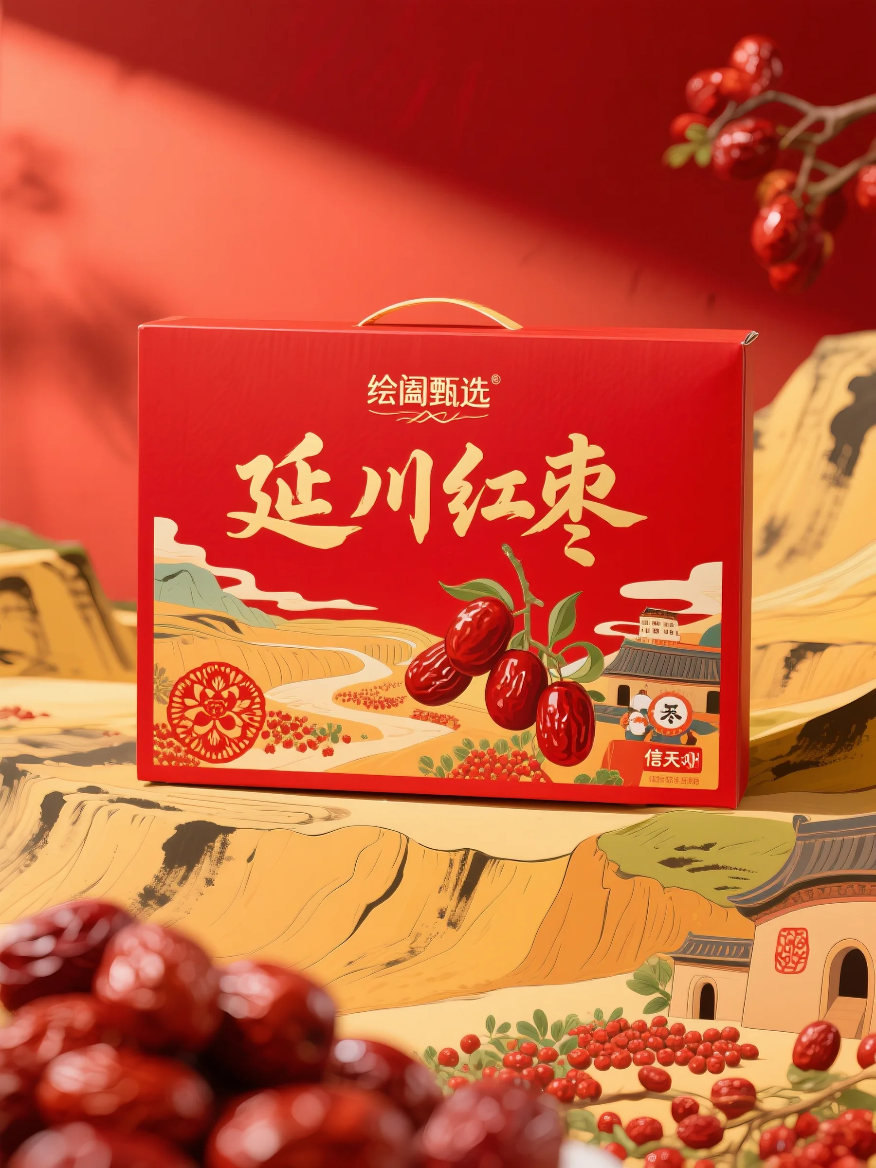 整体风格:融合中国传统元素与延川地域文化,以喜庆、古朴的风格展现产品特色,传递浓厚的乡土情怀与文化底蕴。包装形式:采用红色礼盒设计,配备提手,既符合礼品包装的实用性与美观性,又彰显大气、庄重的视觉效果。色彩运用:以红色为主色调(象征喜庆、热情),搭配黄色(体现黄土高原地貌)、绿色(突出自然生机),色彩对比鲜明,强化视觉吸引力。图案设计:包含红枣插画(直观呈现产品)、延川地貌(沟壑、窑洞等,突出产地特色)、传统剪纸纹样(增添文化氛围),图案丰富且层次分明,生动诠释“延川红枣”的地域属性。文字信息:核心文字“延川红枣”醒目突出,品牌名“绘阖甄选”提升品质感,辅以“信天游”等地域文化符号(如冬季节气、民俗元素),既传递产品信息,又深化文化内涵,增强品牌记忆点。