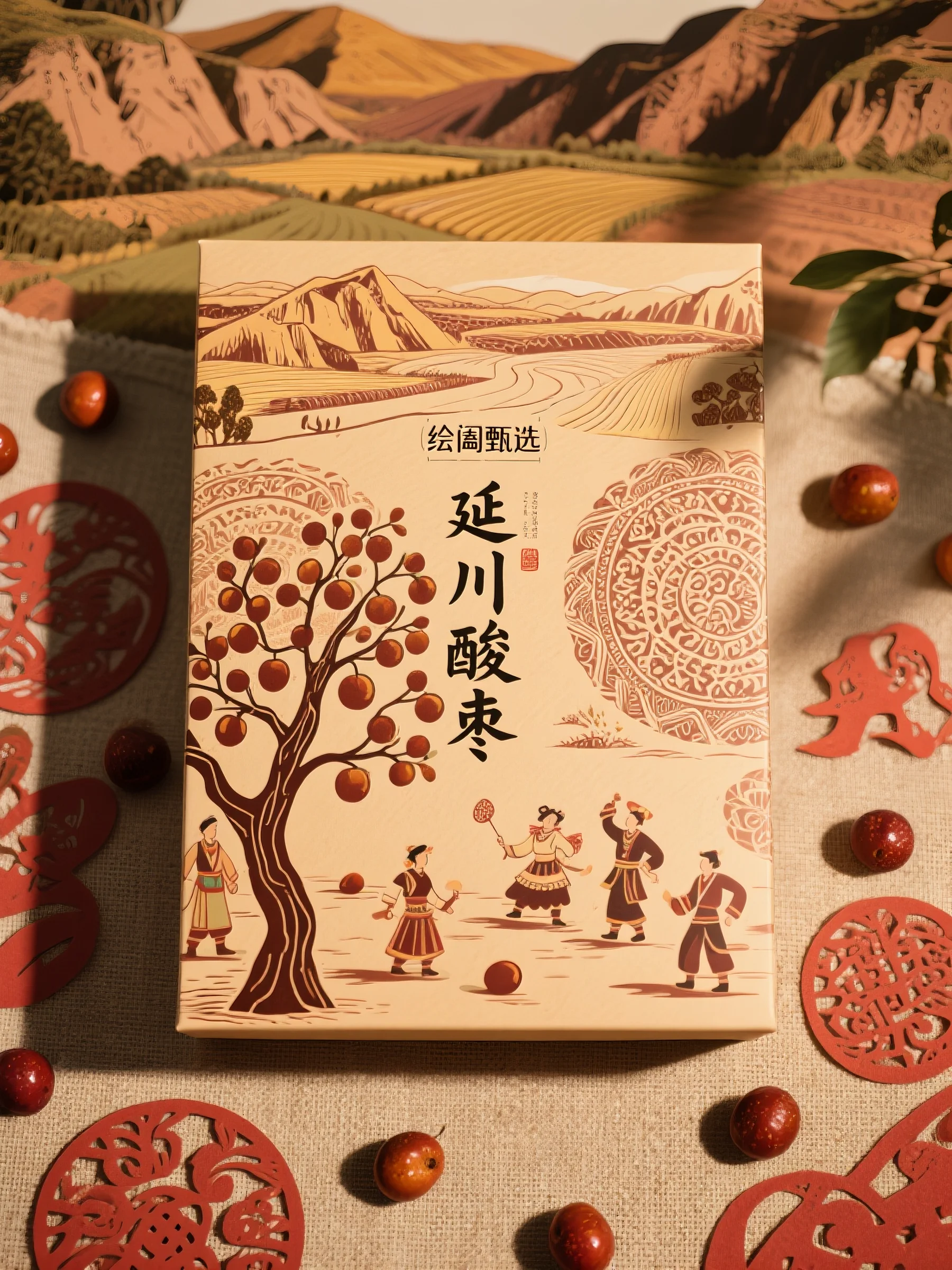 整体风格:融合延川地域文化与传统民俗,通过插画、剪纸元素营造乡土风情,传递产品原生态与文化底蕴,适配礼品场景。包装形式:长方体纸盒,结构简洁,正面视觉聚焦,提升展示效果,满足消费与馈赠需求。色彩运用:暖色调为主,米黄基底搭配自然色系,柔和亲切,凸显天然属性,增强情感共鸣。图案设计:手绘酸枣树、地貌、民俗人物及剪纸纹样,展现产地风貌与人文,强化地域特色,提升记忆点。文字信息:品牌与产品名醒目,辅以文化元素,传递甄选品质与地方特色,增强消费者信任与认知。