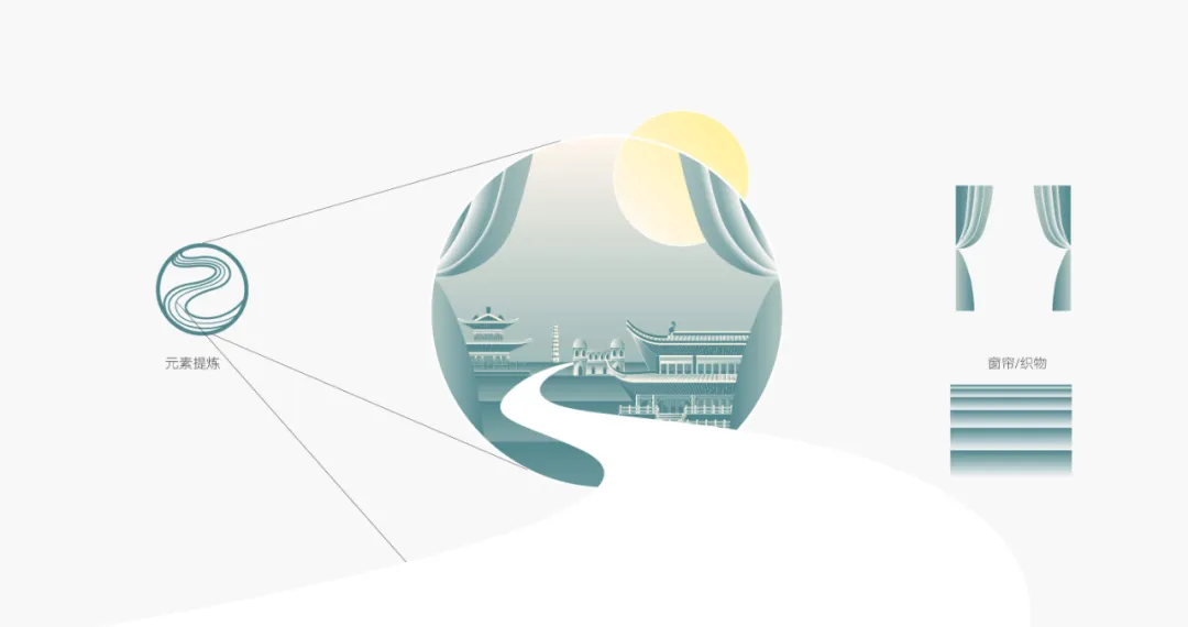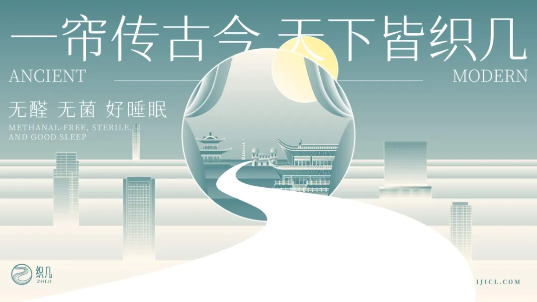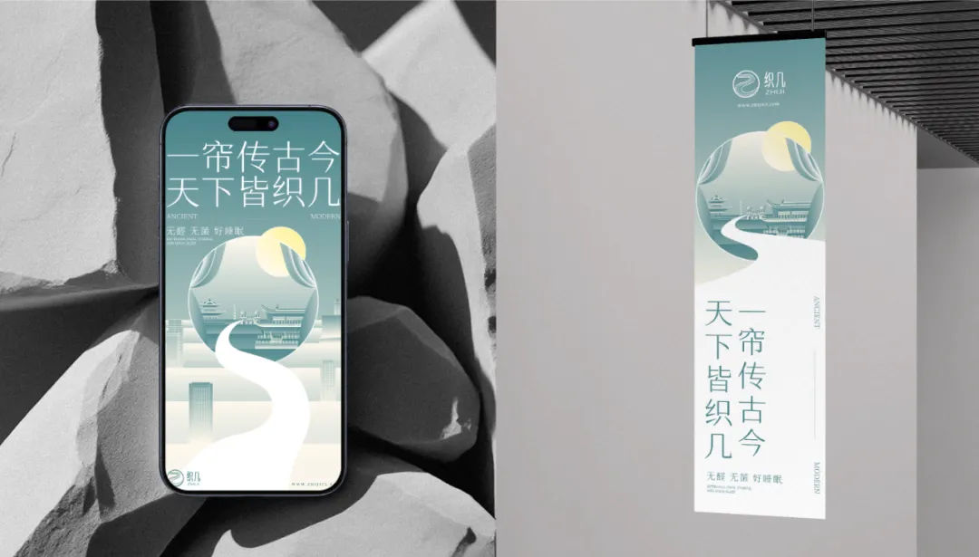 “织几”的设计以 “东方韵律+现代简约” 为核心:Logo 用圆形包裹流动线条,呼应“织”的缠绕、延续感,字体融合书法笔意与几何简洁,传递传统与现代的平衡;主视觉借青灰色调、古建与城市的拼贴,用“一帘传古今”串联文化传承,“无醛无菌”锚定功能价值。从符号到场景,设计构建 “文化+功能” 叙事:流动线条重复出现在背景、图形中,强化品牌识别;古建与现代建筑的对话,暗合“传统工艺适配当代生活”的理念,让“织几”既具东方美学辨识度,又通过功能文案(好睡眠)锚定家纺品类,实现文化质感与实用价值的统一。