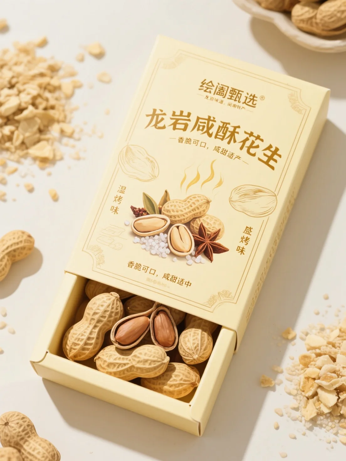 色彩运用:米黄为主,棕金点缀,温暖和谐,契合花生质感,视觉舒适且诱人,传递自然美味。