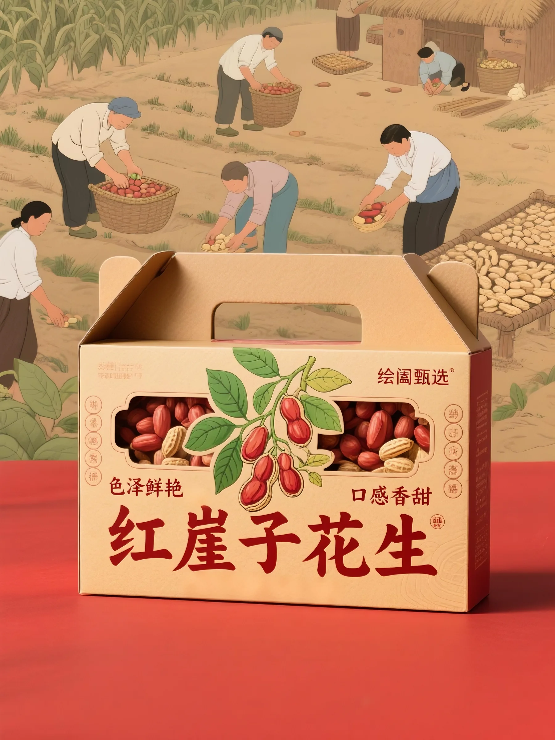 图案设计:花生植株与丰收场景插画,还原农耕文化,强化地域关联;开窗内的花生实物图,直观展产品,唤起口感联想。