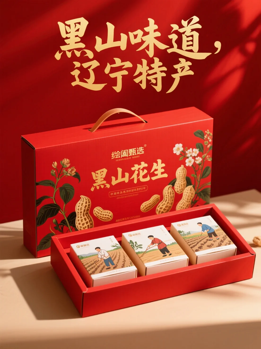 文字信息:品牌名 “绘阖甄选”、产品名 “黑山花生” 及 “黑山味道,辽宁特产” 清晰醒目,突出地域文化和产品特色,文字简洁大气,提升品牌辨识度和产品说服力。