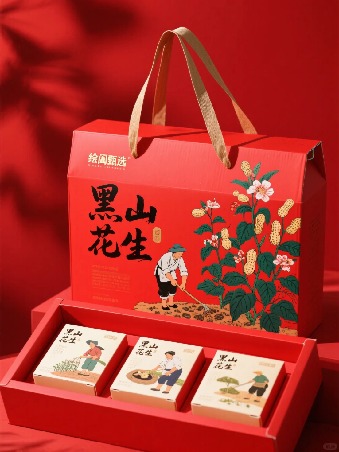 整体风格:田园农耕风,插画展现丰收场景,传递自然质朴的地域特色,营造温馨消费氛围,适配农产品礼品定位。包装形式:手提礼盒,结构稳固、便于携带展示,提升礼品仪式感,兼具实用与视觉美感。色彩运用:红、米黄为主调,搭配绿色插画,色调和谐,突出天然乡土气息,视觉吸睛且温馨。图案设计:花生植株与丰收场景插画,还原农耕文化,直观展产品,唤起口感联想,增强视觉记忆点。文字信息:品牌、产品名醒目,标注地域(辽宁特产)与卖点(色泽鲜艳、口感香甜),文字简洁,提升辨识度与信息传达,强化品质认知。