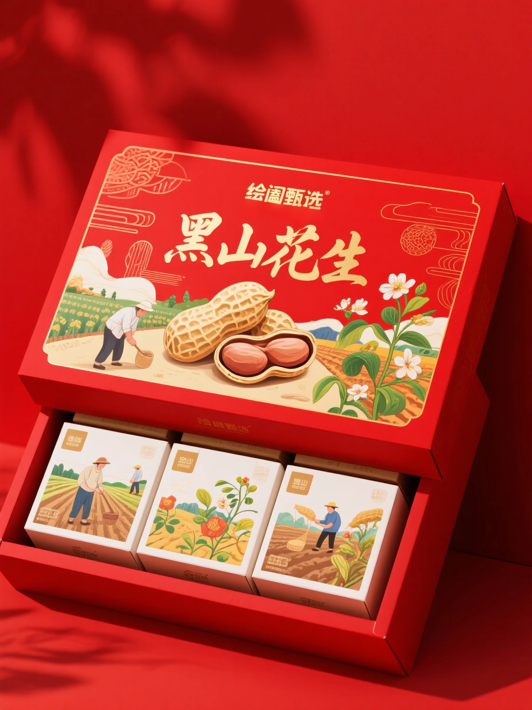 整体风格:传统喜庆与农耕文化融合,红色主调彰显节日氛围,插画展现田园劳作,传递自然质朴与地域特色,适配礼品场景。