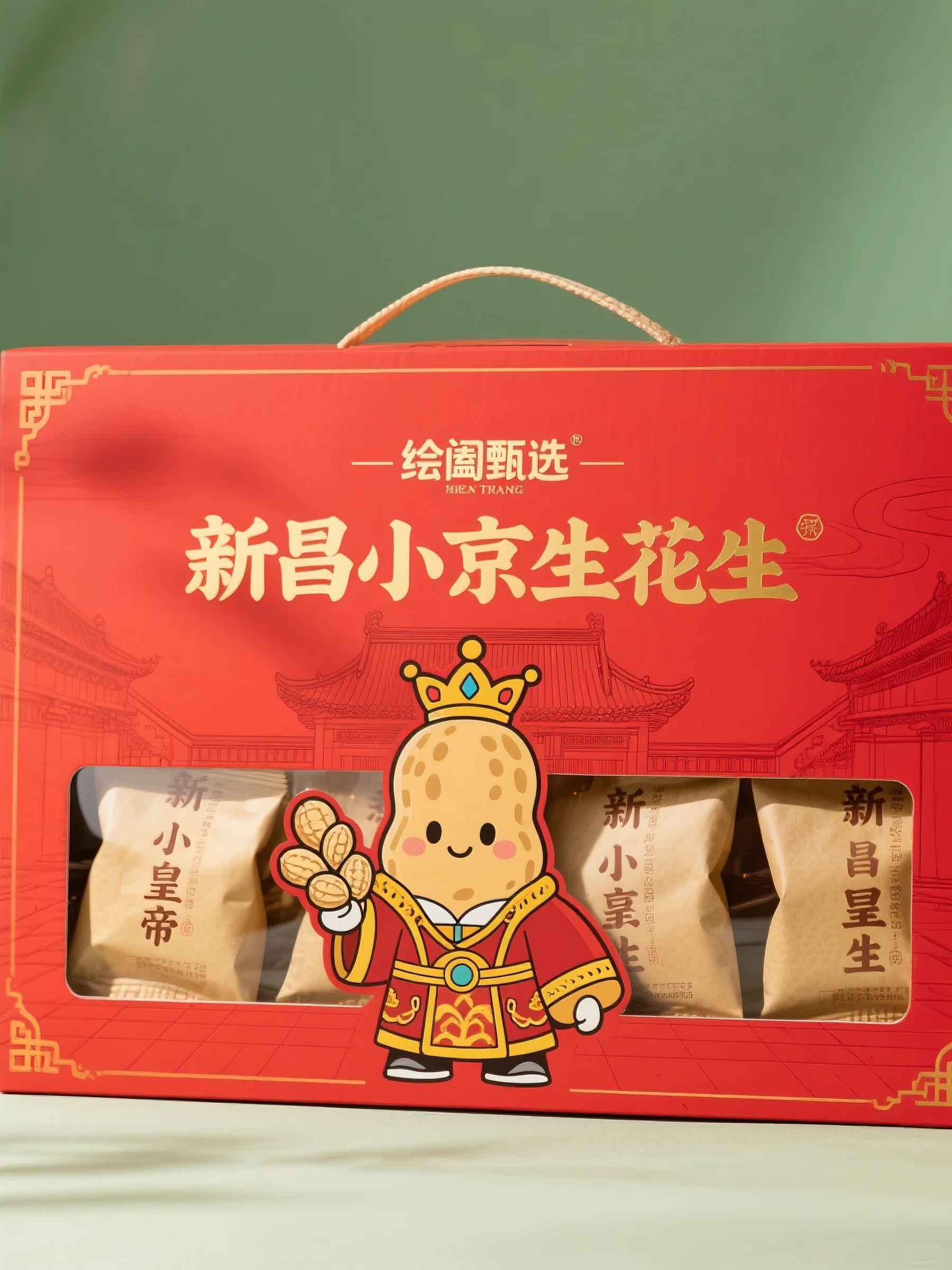 图案设计:卡通花生古装形象搭配古建筑,萌趣且凸显地域特色,花生元素直观呼应产品,增强记忆点。