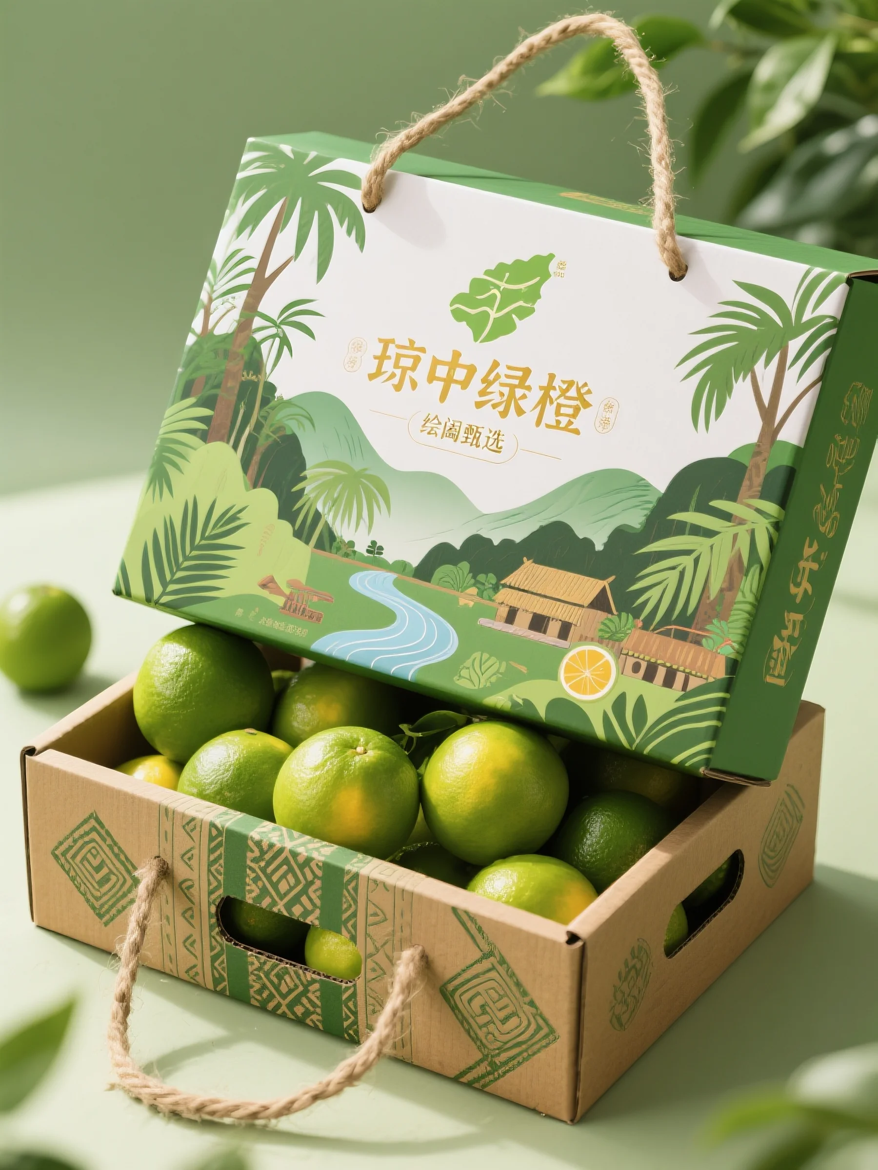 图案设计:绘制棕榈树、溪流、山峦、黎苗传统民居等,复刻琼中地理风貌与民族建筑,将自然景观与人文符号融合,既展现绿橙生长的生态环境,又传递当地民族文化,让包装成为地域文化的 “微缩窗口” 。