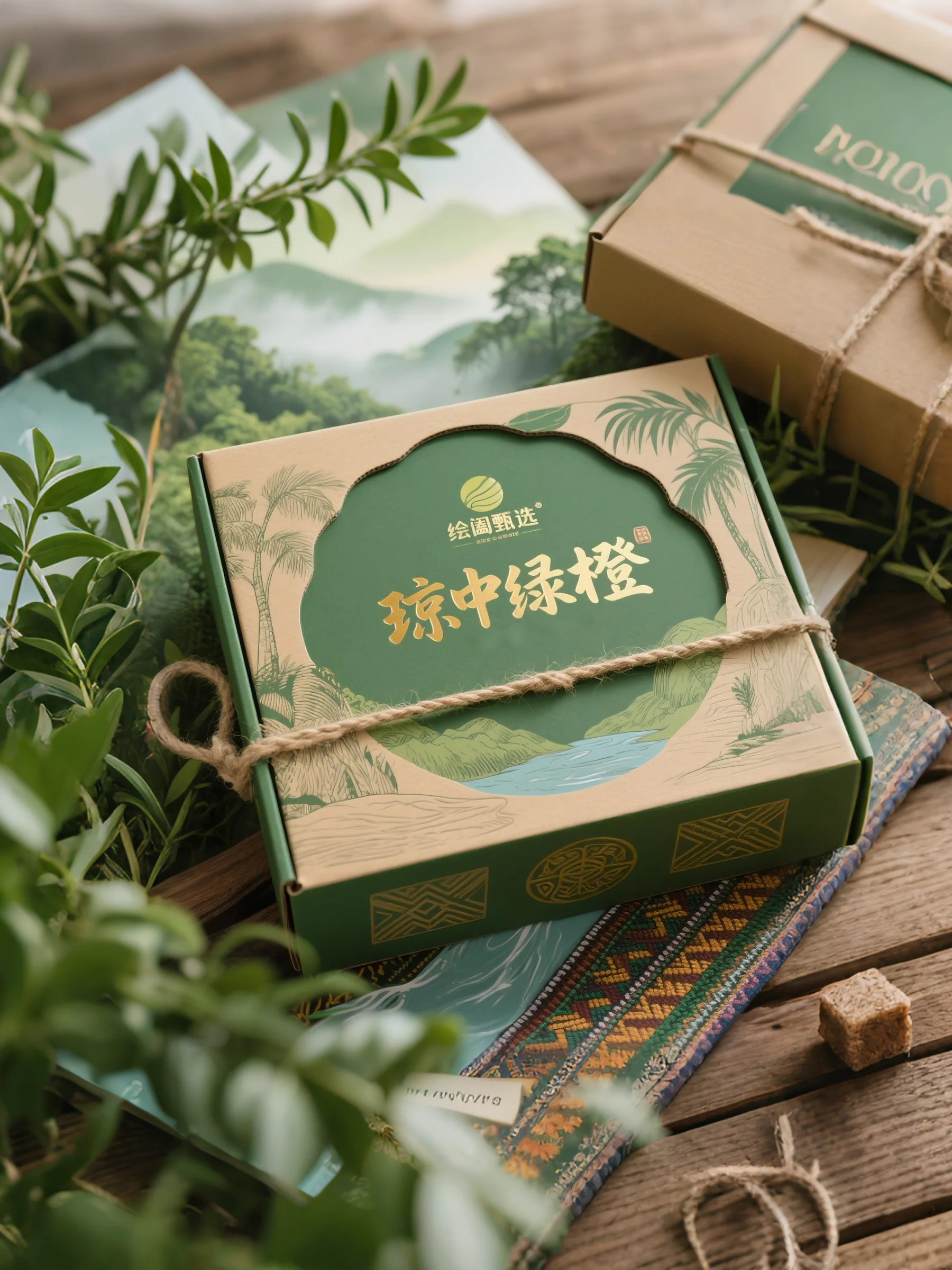 整体风格:清新自然风,以绿植、山水插画为背景,搭配质朴包装材质,营造出融合琼中生态与民族文化的氛围,传递产品天然、原生态的特质,视觉和谐且富有地域韵味。包装形式:采用方正纸盒造型,麻绳捆扎增添质朴感,便于手提与收纳。盒型简约实用,能稳固保护内部果实,同时展示面清晰,利于呈现包装设计细节,契合礼品与实用需求。色彩运用:以浅棕、绿色为主色调,浅棕模拟自然材质质感,绿色呼应绿橙与生态环境,搭配山水图案的蓝、绿过渡色,色调统一且富有层次,凸显清新自然与地域生态关联。图案设计:融入棕榈树、山水、民族纹样等元素,山水插画展现琼中地理风貌,民族纹样点缀强化地方文化属性,图案布局围绕 “琼中绿橙”,生动诠释产地特色与自然环境 。文字信息:突出 “琼中绿橙” 品名,“绘阆甄选” 体现品质背书,文字采用适配自然风格的字体,金色字体在绿色背景上醒目突出,简洁明了传递产品身份与品牌信息,加深消费者认知 。