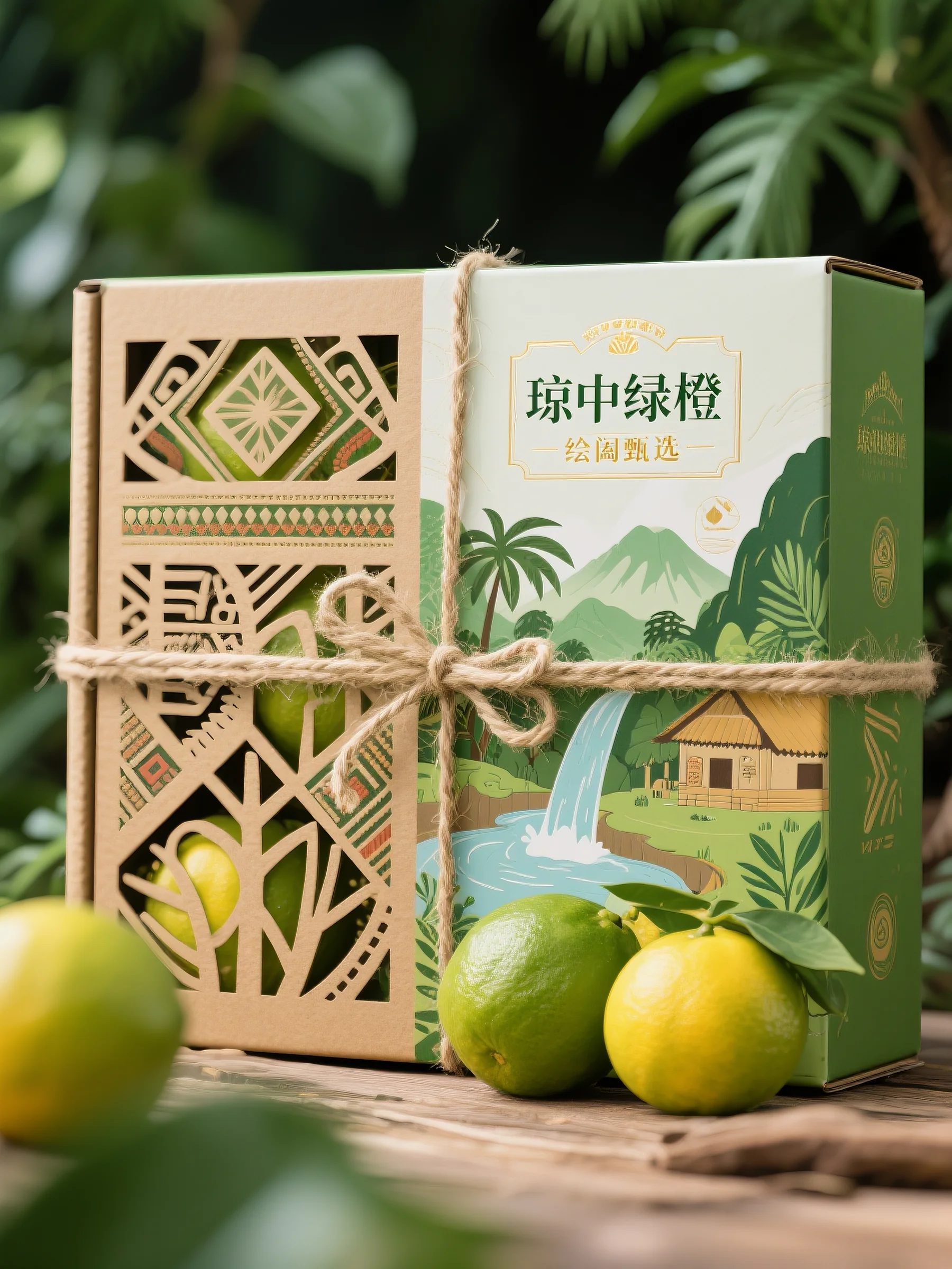 整体风格:将清新自然与民族文化巧妙融合,以山水田园插画展现琼中生态,搭配黎族纹样镂空设计,既呈现绿橙生长环境的纯净,又传递当地独特人文,营造出富有地域特色的清新质感。