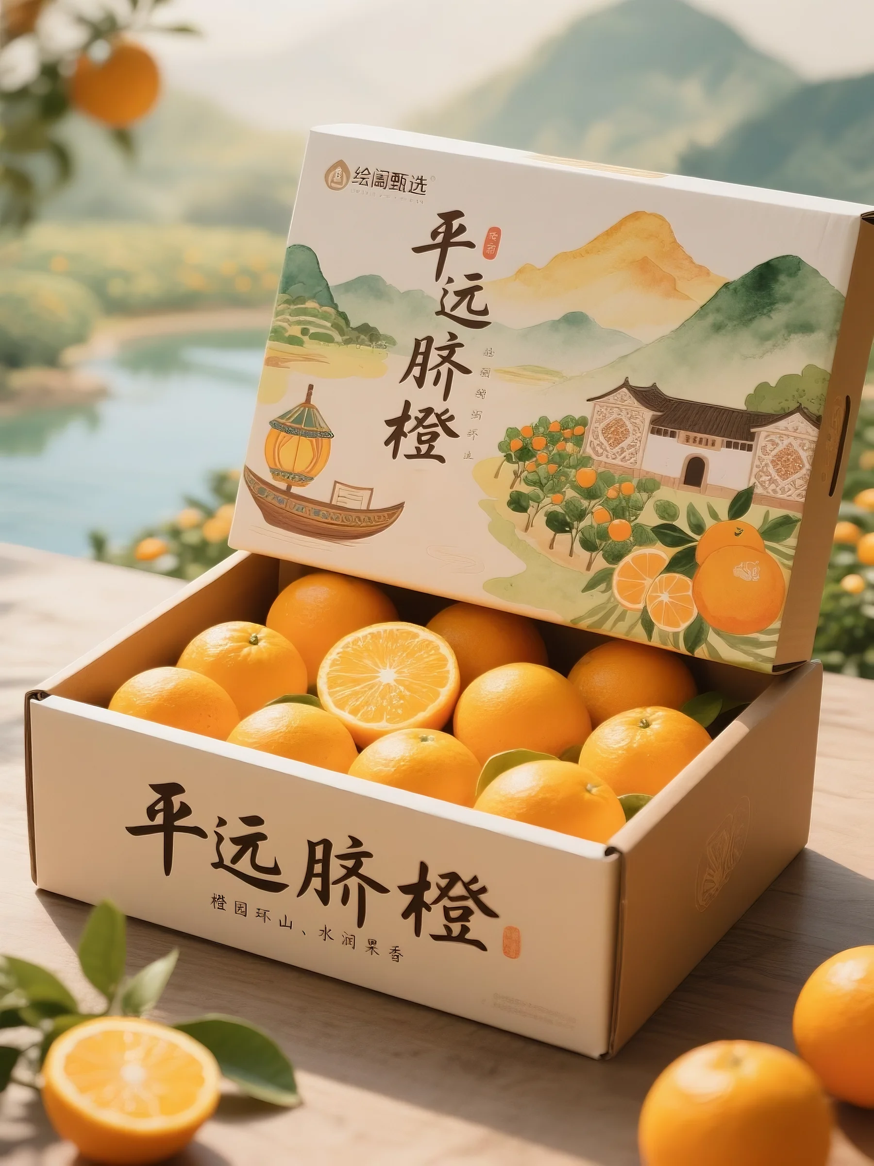 整体风格:融合手绘水彩与中式意境,以平远山水、脐橙园为画面,营造清新自然又具文化底蕴的氛围,传递平远脐橙生长环境的生态美与地域人文特色。