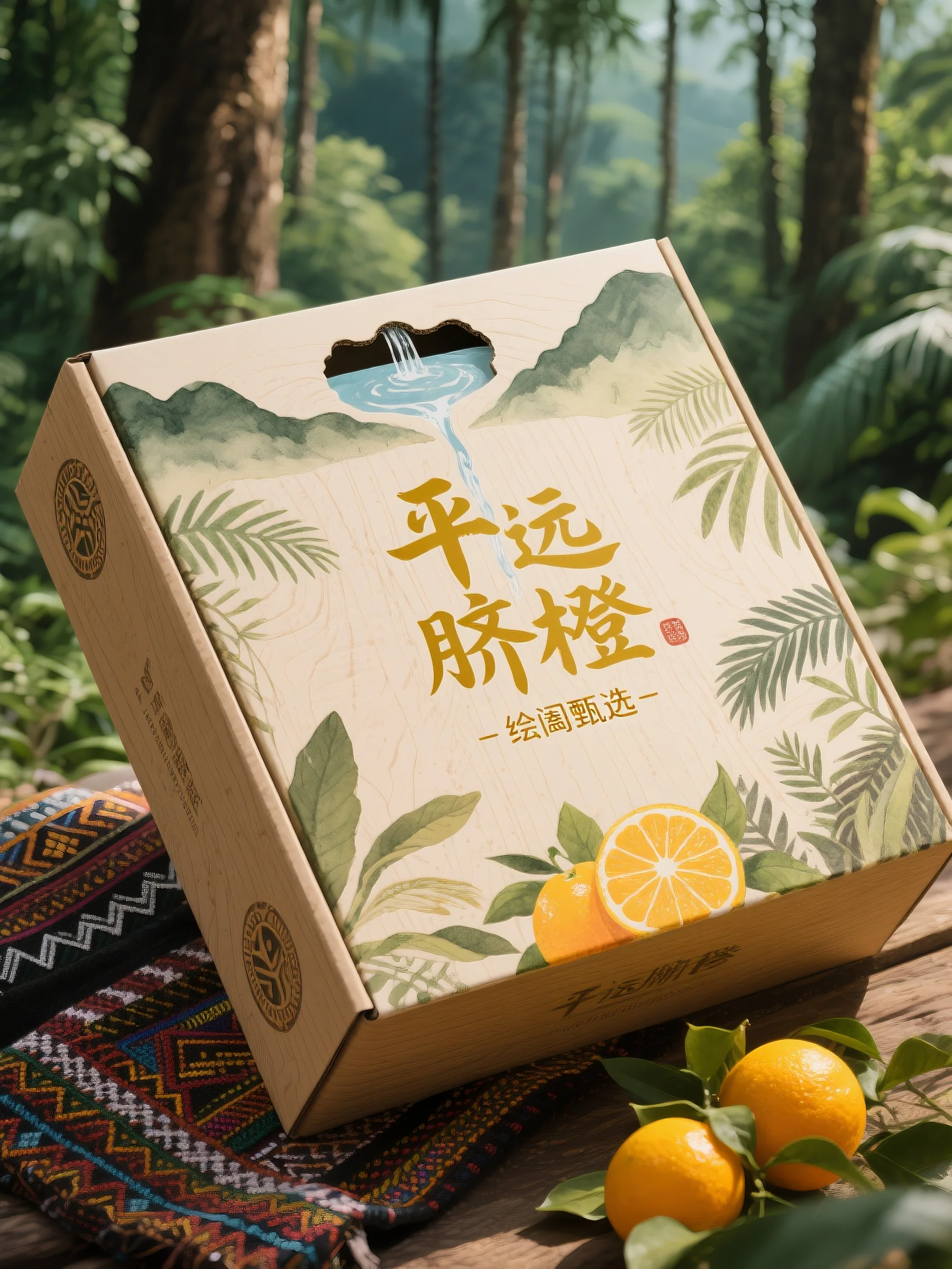 图案设计:手绘呈现平远山水环绕橙园的场景,有山、水、橙树、果实,还原产地生态,直观展现 “橙园环山” 环境,增强产品地域辨识度。