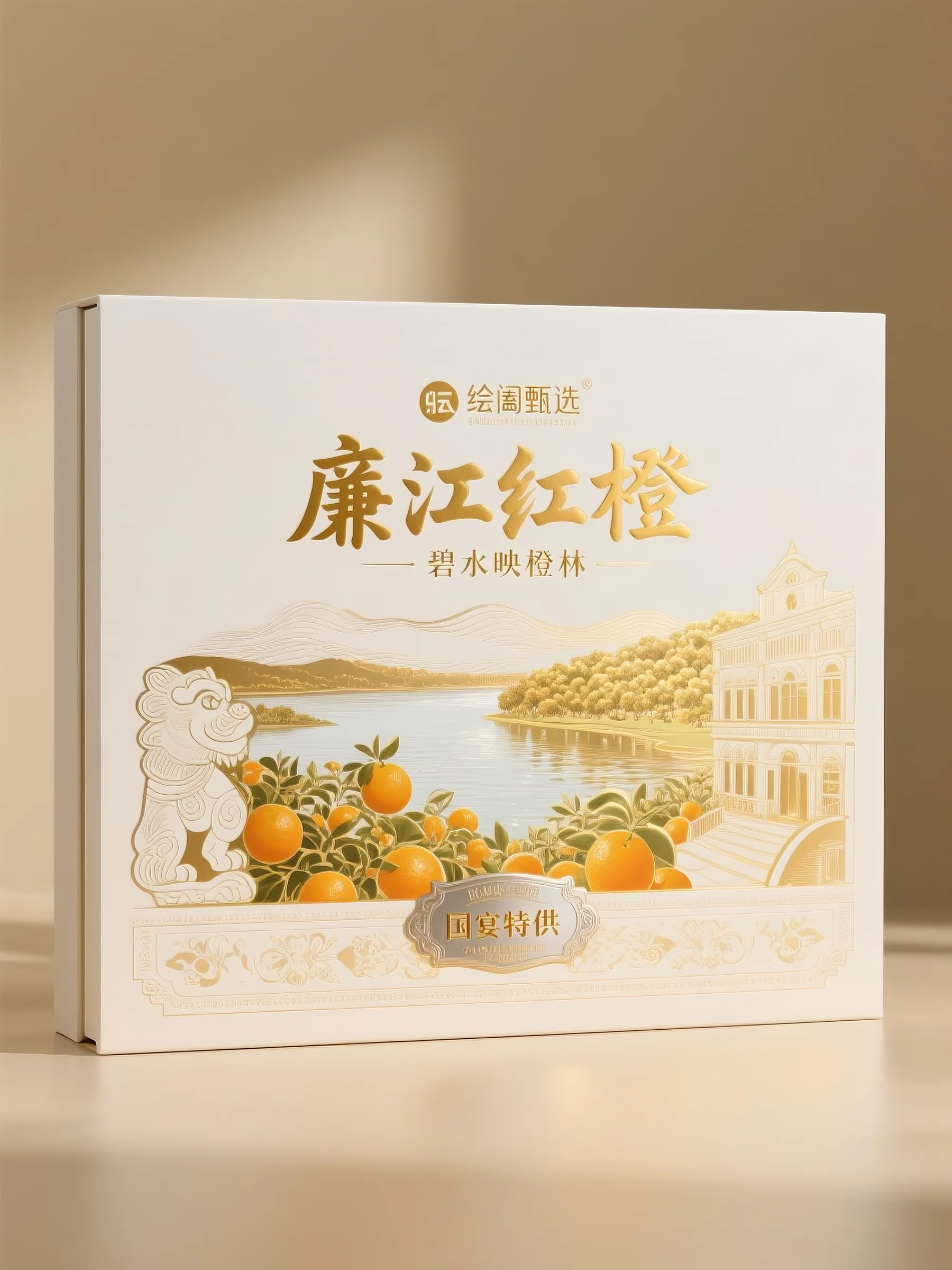 整体风格:融合传统与现代,以浅米色为底,搭配烫金工艺,将廉江山水、建筑、石兽等元素艺术化呈现,营造出高端典雅且具地域文化底蕴的风格,尽显国宴特供的质感 。包装形式:采用简洁的翻盖式纸盒,规整大方,便于开启与展示,能有效保护果品,简洁线条契合高端礼盒定位,传递精致感 。色彩运用:以柔和浅米色为主色调,搭配暖金色图案与文字,营造温馨、高贵氛围,金色凸显品质,浅米色平衡视觉,让包装典雅不张扬 。图案设计:绘制石兽、红橙林、山水、建筑,石兽彰显地域文化,红橙林突出产品,山水建筑勾勒廉江风貌,组合呈现产地特色与生态优势 。文字信息:“廉江红橙” 等大字突出产品,“国宴特供” 强化品质背书,“碧水映橙林” 增添诗意,品牌名 “绘阖甄选” 提升信任度,文字简洁有力,传递核心价值 。