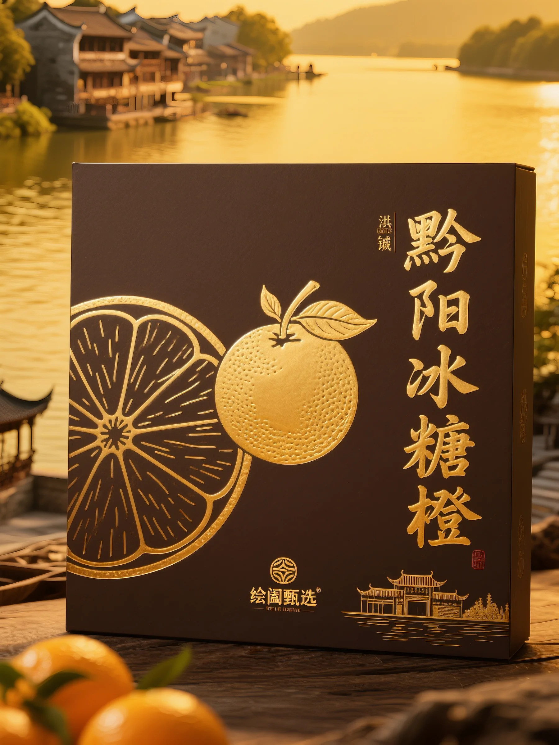 整体呈现:走高端典雅路线,深棕底色搭配烫金元素,结合背景山水古建,将地域文化与奢华质感融合,营造出兼具文化底蕴与品质感的氛围,适配高端馈赠场景。包装形式:采用规整硬盒结构,简洁大方,便于陈列与收纳,能给予内部果实稳妥防护,开启与使用流程顺畅,传递出精致、专业的产品态度 。色彩运用:以深棕色为基础色调,沉稳且显质感,大面积烫金图案、文字点缀,形成强烈视觉反差,既提升华贵感,又借暖金色呼应冰糖橙的 “甜” 与背景暖黄氛围,和谐统一 。图案设计:主体呈现冰糖橙果实与切片,直观展现产品,形态写实又经艺术化处理,搭配背景山水古建,巧妙融入黔阳地域风貌,强化产品与产地关联,传递风土特色 。文字信息:“黔阳冰糖橙” 清晰标注产品,“洪城” 点明地域,“绘阖甄选” 体现品牌,文字以金色呈现,醒目易读,既传递关键信息,又借书法字体增添文化韵味,助力品牌与产品识别 。