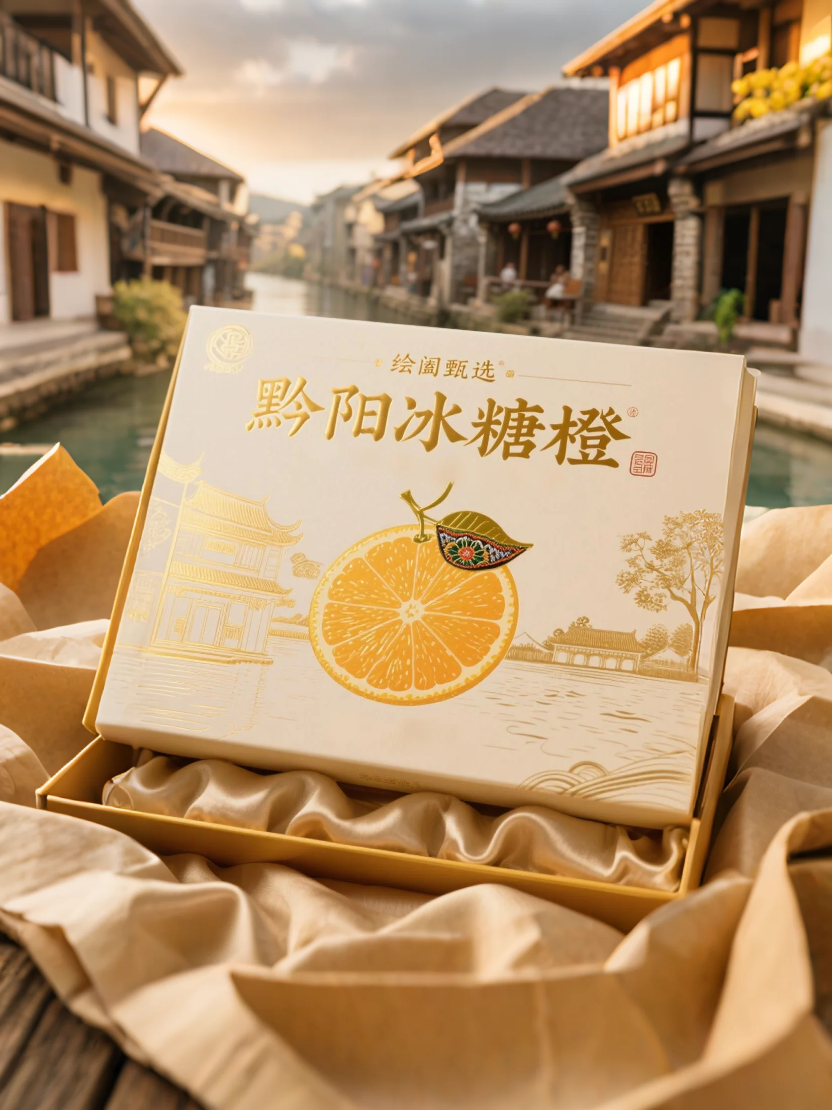 整体风格:新中式雅致风,融合地域文化与轻奢质感。浅米白底色搭配烫金元素,营造出简洁、温润又不失格调的氛围,借古建背景传递黔阳历史韵味,适配高端伴手礼、文化属性强的消费场景 。包装形式:采用天地盖硬盒结构,开启仪式感足。盒内衬以绸缎材质,柔软且显档次,能有效防护果品,规整造型便于陈列、收纳,契合礼品包装 “精致、体面” 的需求 。色彩运用:以柔和米白为底色,清新柔和,降低视觉压迫感;烫金图案、文字提亮,增添华贵气息,橙子切片的自然橙黄,丰富色彩层次,暖色调组合营造温馨、高端的视觉感受 。图案设计:核心是写实冰糖橙切片,直观呈现产品;搭配金色古建、山水、树木,融入黔阳地域景观,强化产地关联;叶片处的民族花纹点缀,增添民俗文化细节,让图案既有产品识别性,又具文化故事性。文字信息:“黔阳冰糖橙” 明确产品,“绘阖甄选” 体现品牌,文字以烫金书法字体呈现,醒目且具文化韵味,快速传递关键信息,提升品牌辨识度,也呼应整体新中式风格 。
