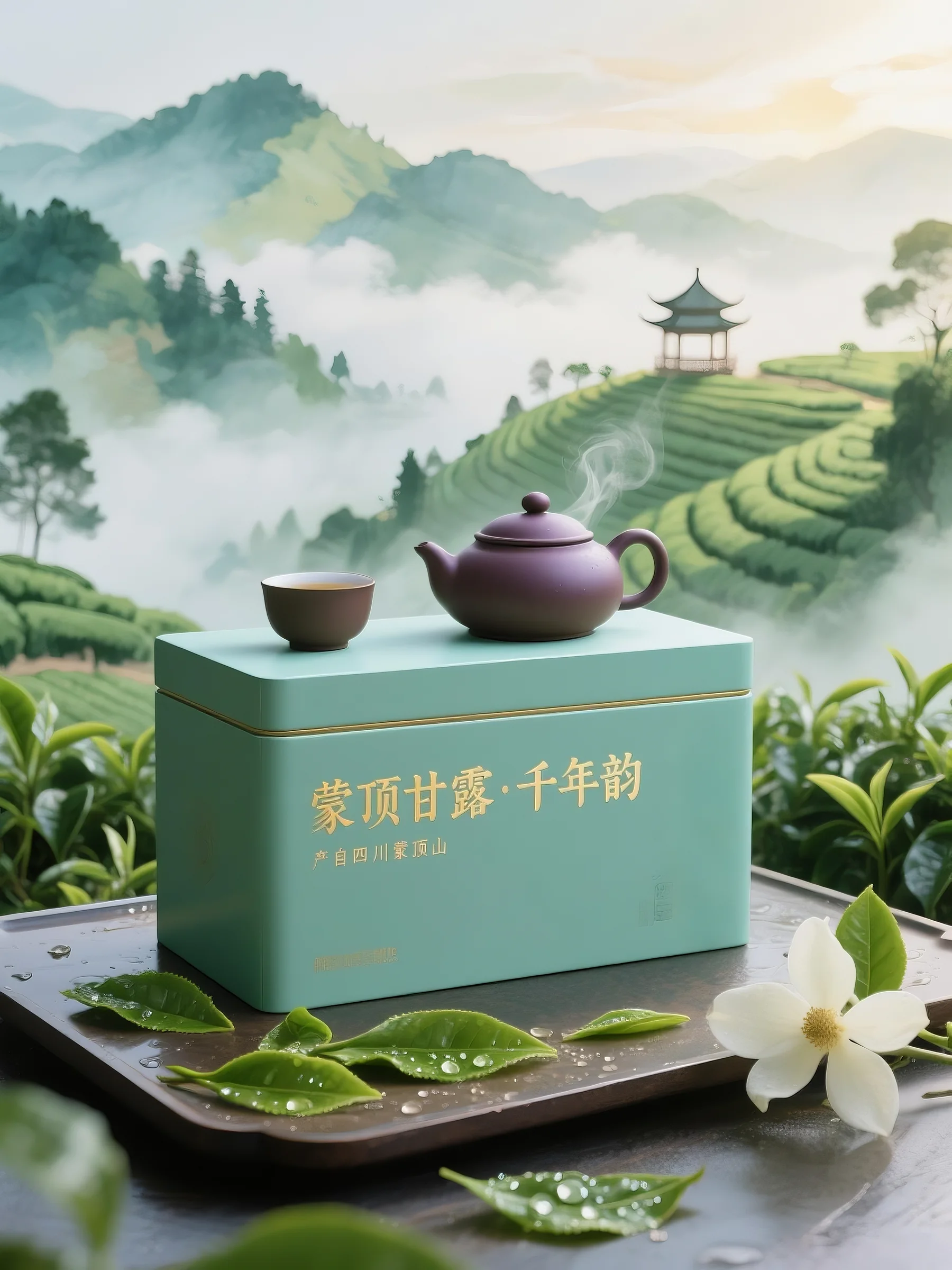 色彩运用:色彩以 “清新自然” 为核心:茶盒选取浅青绿色,呼应茶园的生机与蒙顶甘露的鲜爽特质;紫色茶壶形成冷暖对比,增添典雅感;背景云雾的白、山峦的绿灰渐变,营造朦胧层次;叶片水珠的晶莹、白色山茶花的点缀,强化 “鲜润” 视觉符号。整体色调统一于自然色系,传递 “生态、鲜醇” 的产品联想 。