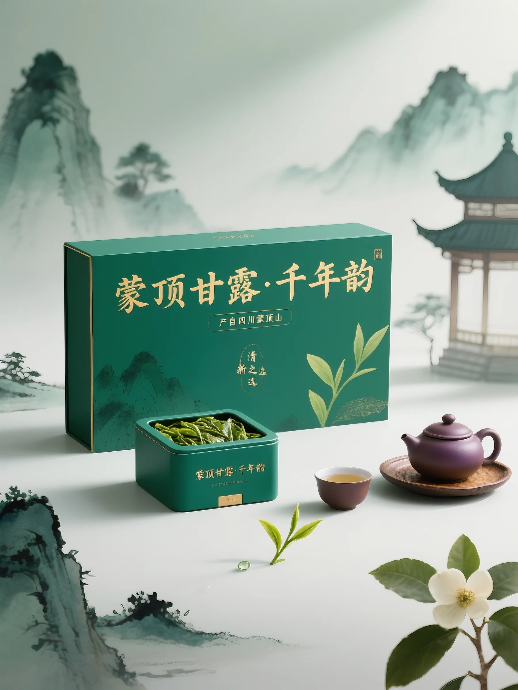 色彩运用:主色调选用 深墨绿 ,既呼应茶叶的自然属性,又传递 “清新、健康” 的视觉联想;辅以 烫金文字 ,金与绿的碰撞,既凸显高贵质感,又强化 “千年韵” 的历史厚重感。色彩对比克制而精准,在古朴中透出典雅,契合高端绿茶的定位,也暗合蒙顶山茶文化的深沉底蕴。