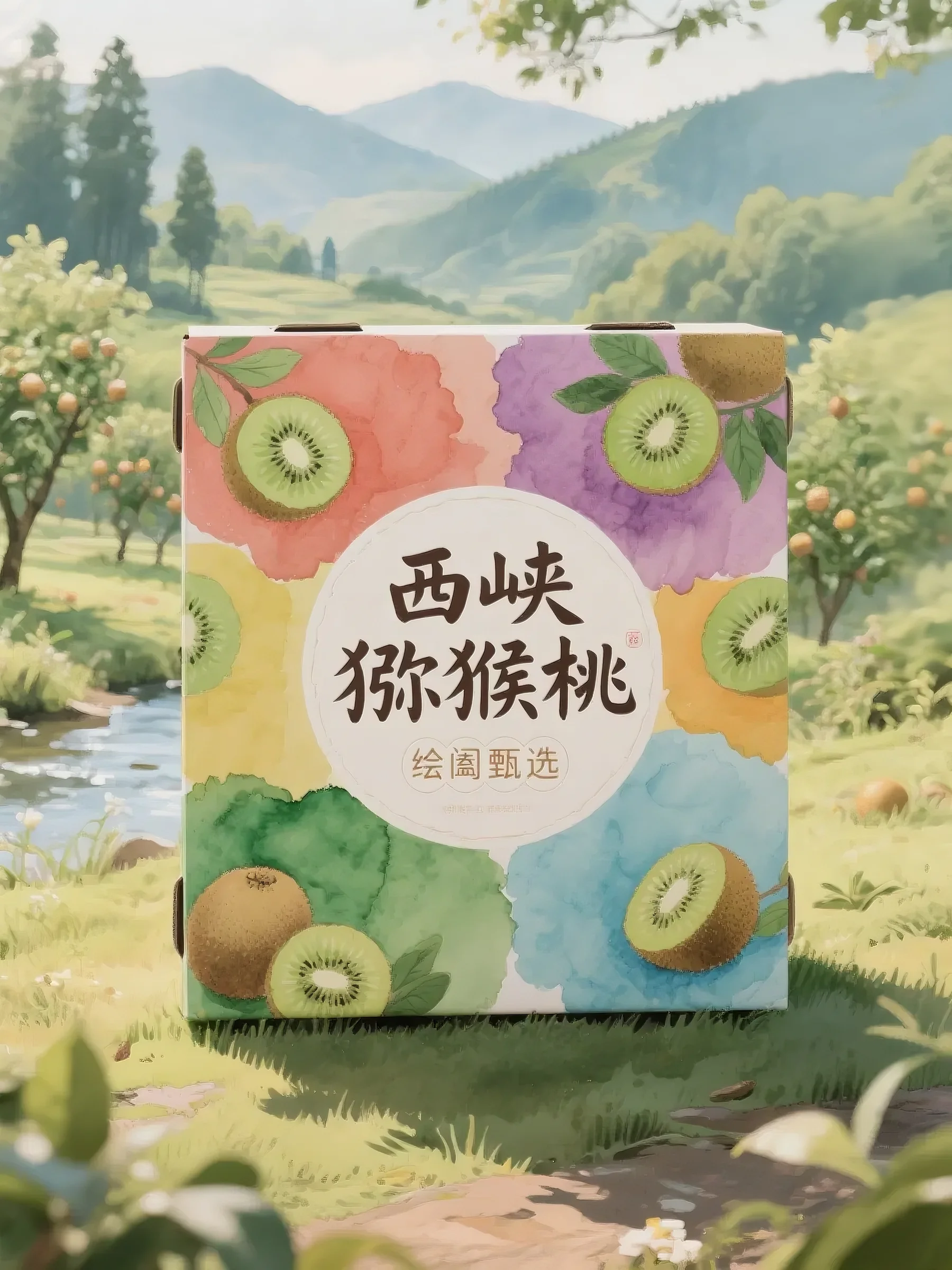 图案设计:将猕猴桃果实(整果 + 切片)与水彩色块结合,点缀枝叶元素,画面布局对称且富有韵律;背景融入西峡田园风光(山水、果树、溪流 ),虚实结合间,把产品生长环境与形态直观呈现,凸显地域生态特色。