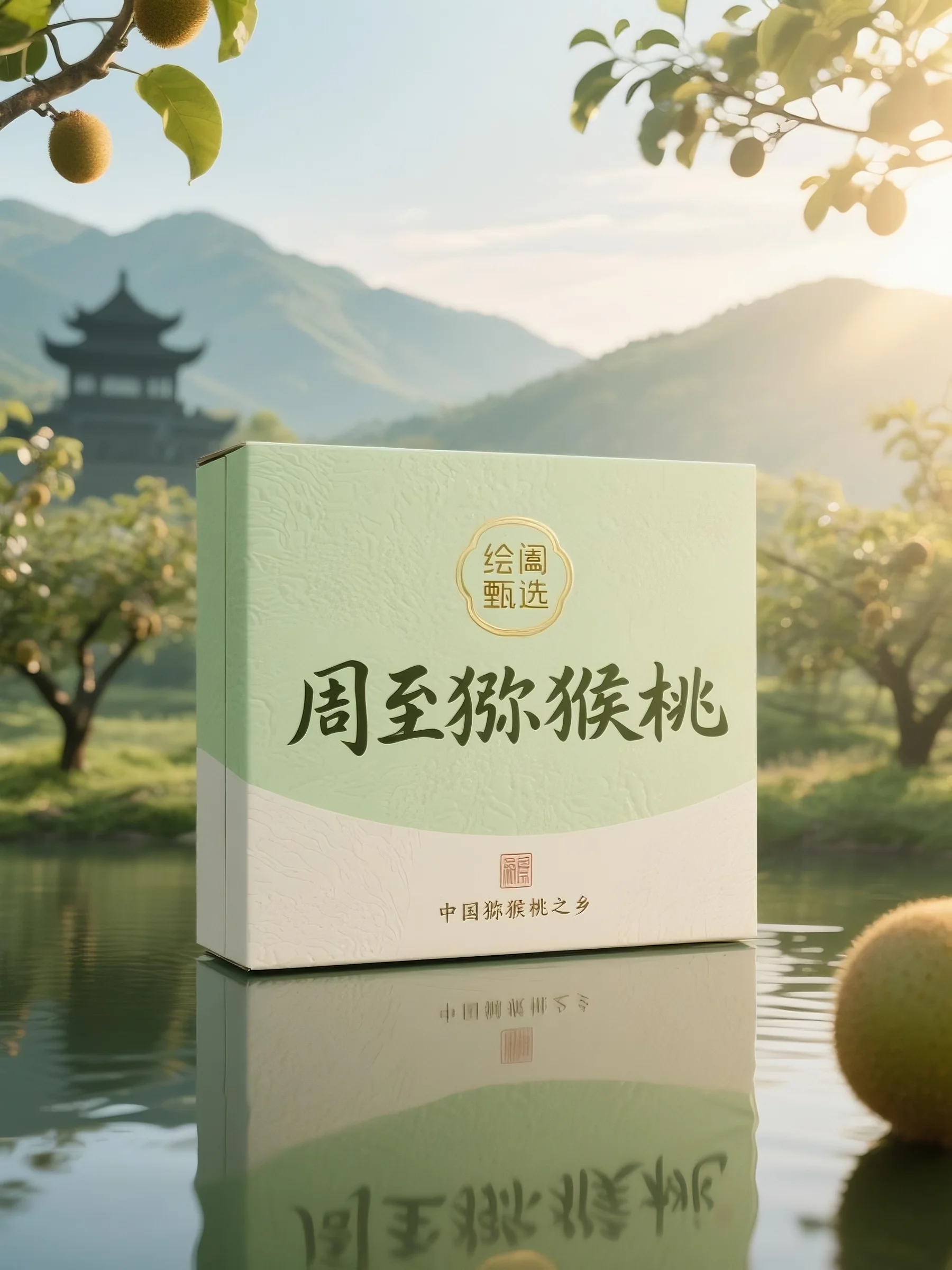 整体风格:走新中式极简风,以山水田园为背景,包装通过简约排版与质感工艺,传递出周至猕猴桃生长环境的清幽生态,营造典雅、宁静的东方美学氛围,凸显自然与人文的融合。