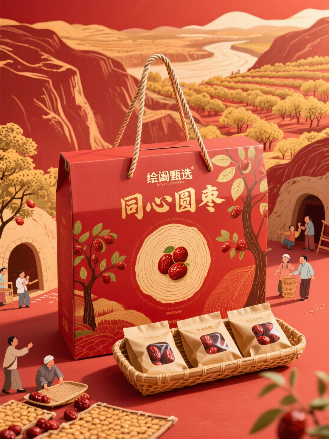 整体风格:国风乡土融合,红色主调配丰收插画,营造喜庆传统氛围,彰显地域文化与礼品属性。包装形式:手提礼盒+编织提手,内配独立小袋,兼具便携性与仪式感,实用美观。色彩运用:红金为主,暖色调插画呼应,凸显喜庆吉祥与天然特色,视觉和谐吸睛。图案设计:红枣树、果实、劳作场景插画,生动展原料与产地文化,增强故事性与记忆点。文字信息:品牌、产品名醒目,地域文化细节(窑洞等)强化特色,传递品质与文化价值,提升辨识度。