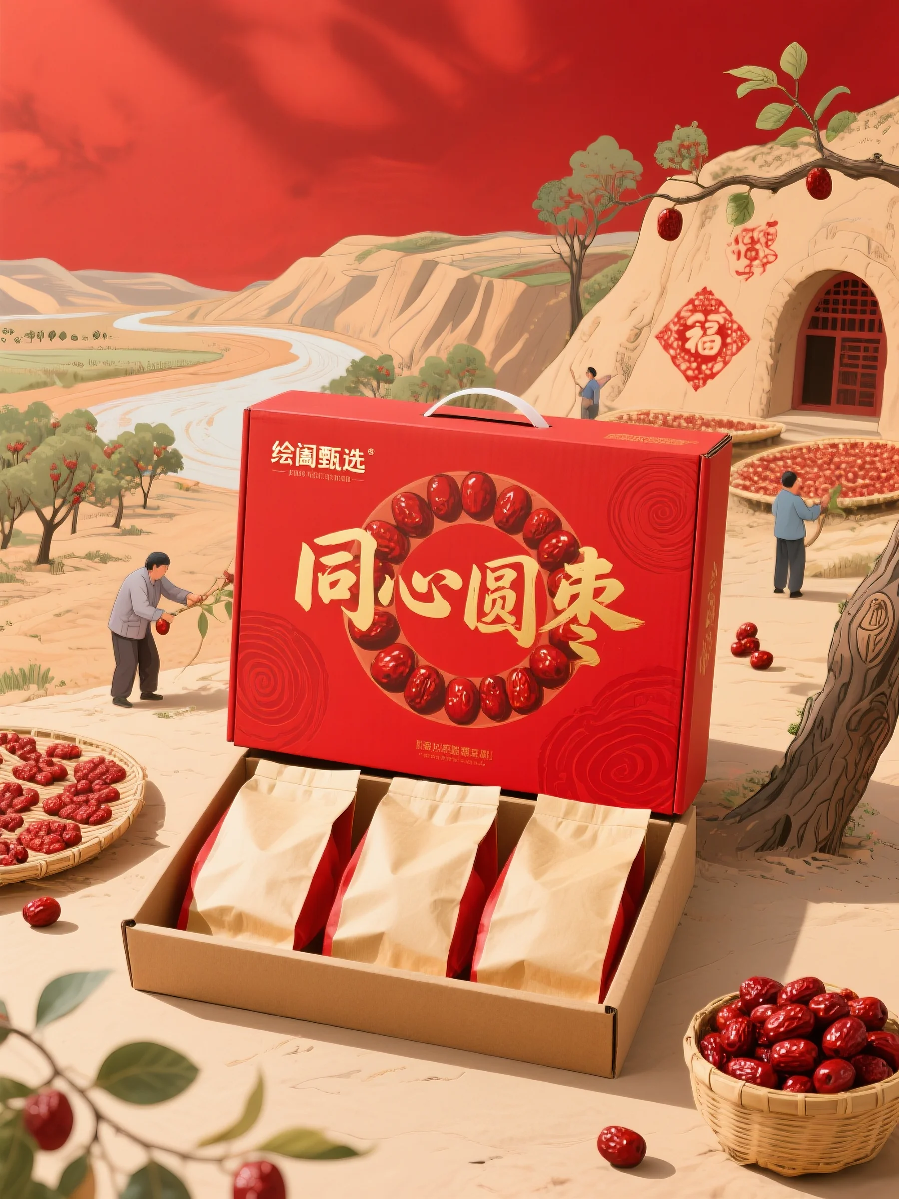 整体风格:融合陕北乡土文化与传统节庆氛围,以红色主调展现地域特色,传递丰收喜悦与礼品质感,契合节日送礼场景。