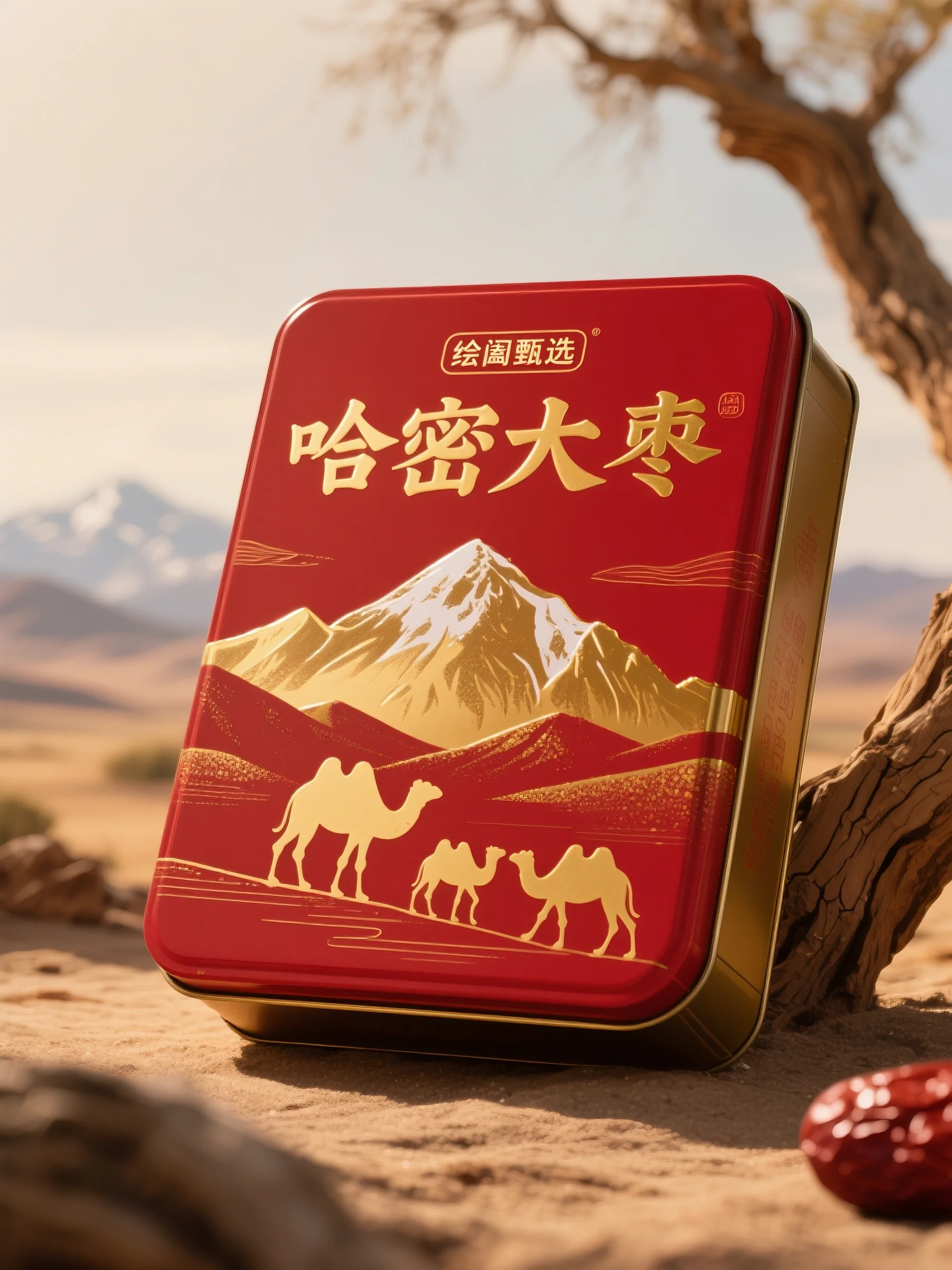 整体风格:融合西域风情与传统礼赠感,红金配色彰显尊贵,图案展现哈密地域特色,营造浓郁文化氛围与高端质感。包装形式:方形铁盒设计,坚固耐用,便于保存携带,提升礼品仪式感,适配高端消费场景。色彩运用:红色主调烘托喜庆,金色点缀凸显品质,与沙漠背景呼应,强化视觉冲击力与地域文化联想。图案设计:雪山、骆驼、沙漠插画,生动呈现哈密自然风貌,传递产品生长环境的独特性,深化地域文化记忆。文字信息:品牌与产品名醒目,简洁传达“甄选”与“哈密大枣”核心信息,增强辨识度,凸显产地优势与品质承诺。