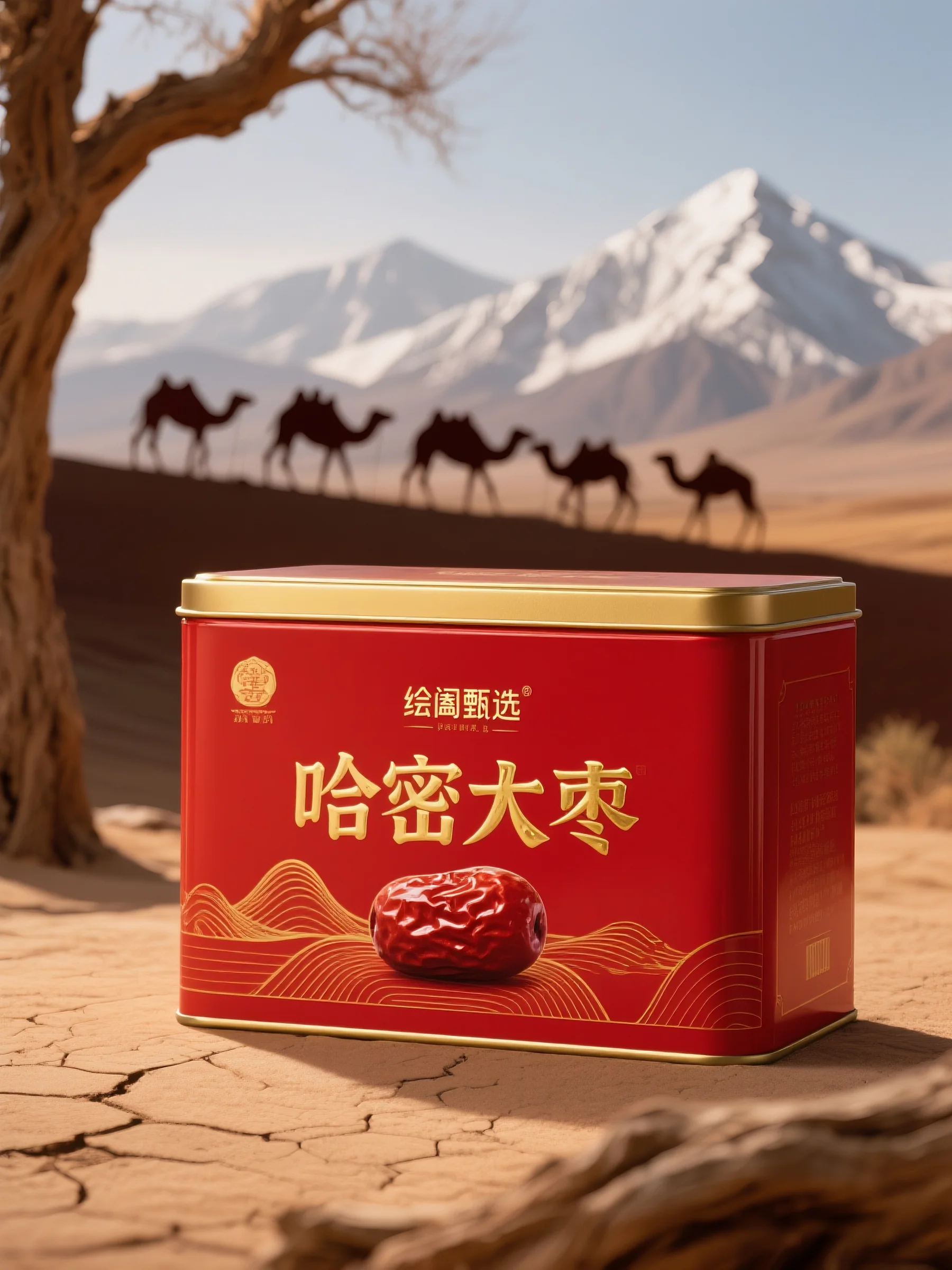 整体风格:西域风情与传统礼赠感融合,红金配色显高端喜庆,地域特色浓郁,传递产品珍贵独特。包装形式:方形铁盒,坚固便携,提升礼品仪式感,适配高端馈赠场景。色彩运用:红色主调配金色,象征吉祥尊贵,与大漠背景呼应,强化视觉冲击与文化联想。图案设计:哈密大枣实物图+金色山脉,直观展产品,呼应产地景观,凸显天然纯正特质。文字信息:品牌与产品名醒目,侧面文字丰富背景,增强辨识度与消费者信任,突出甄选品质。