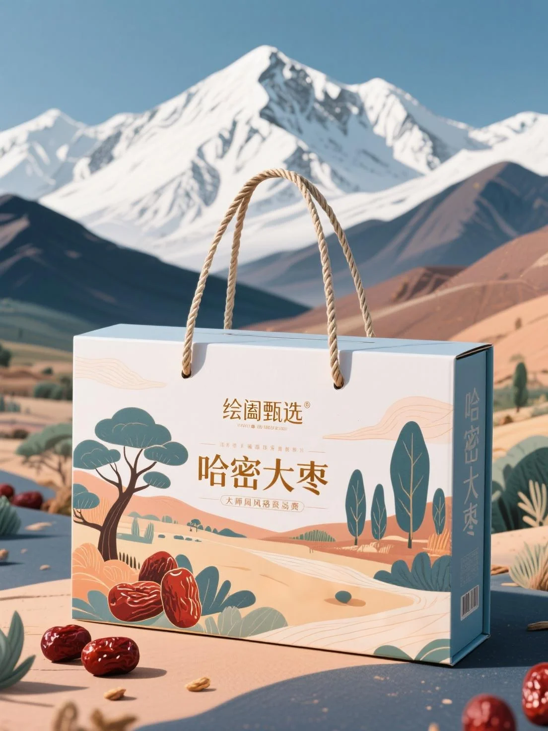 整体风格:清新自然,融合哈密大漠风光插画,营造原生态诗意氛围,凸显产品天然纯净。包装形式:手提礼盒配麻绳提手,兼具便携性与仪式感,适配馈赠场景,提升消费体验。色彩运用:柔和蓝绿棕米色调,搭配红枣深红,和谐雅致,突出大漠特色与产品主体,视觉舒适。图案设计:手绘大漠景观与大枣实物结合,展现生长环境,强化地域文化,增强包装观赏性与记忆点。文字信息:品牌、产品名醒目,辅以文化描述,传递甄选品质与内涵,提升辨识度和消费者信任。