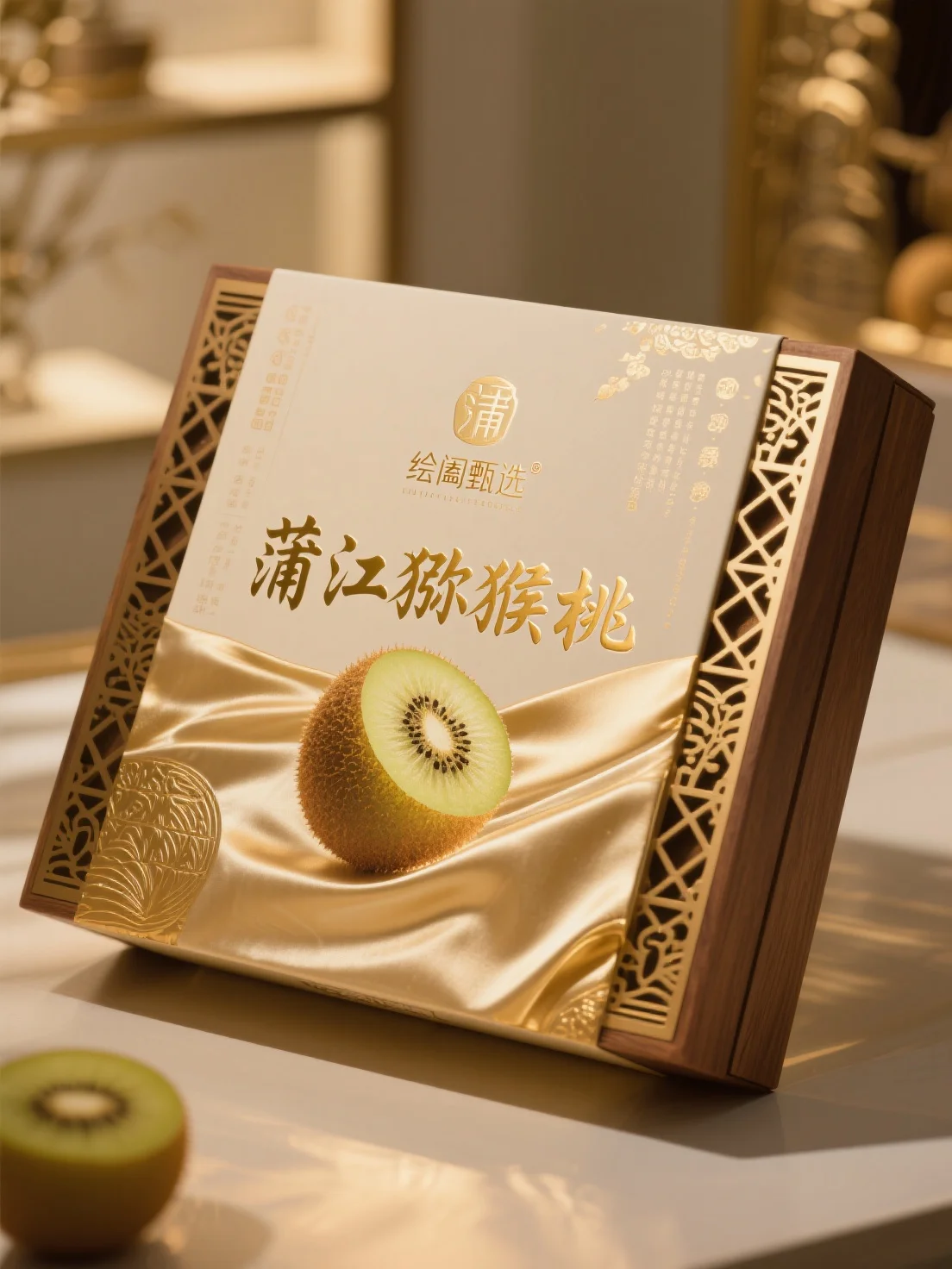 整体呈现:定位高端新中式,以木质材质、镂空雕花、烫金工艺结合,将传统工艺美学与现代品质感融合,传递蒲江猕猴桃 “珍稀生态 + 地域文化” 的高端价值,适配高端礼品、商务馈赠场景,凸显格调与档次 。包装形式:采用 “木质外盒 + 内盒” 结构,木质材质显质感,盒型方正稳固;开合设计兼具仪式感与实用性,通过硬质外壳保护内部果品,借材质与结构强化产品 “高端甄选” 属性 。色彩运用:以浅金、深棕(木质 )为主色调,浅金传递华贵,深棕凸显沉稳;色彩搭配简约且富有层次,借金色的视觉张力,凸显蒲江猕猴桃作为地理标志产品的品质感与价值感 。图案设计:主体展示新鲜猕猴桃果实(整果 + 切片 ),搭配丝缎质感底纹,将产品 “新鲜生态” 与 “高端品质” 直观呈现;两侧镂空雕花融入传统纹样,暗合蒲江地域文化底蕴,强化 “生态 + 文化” 的双重联想 。文字信息:突出 “蒲江猕猴桃” 核心名称,“绘阖甄选” 强调品牌背书,搭配书法字体与文化印章;文字排版聚焦视觉中心,借中式字体的厚重感与文化底蕴,传递产地优势、品牌价值,提升辨识度与信任感 。