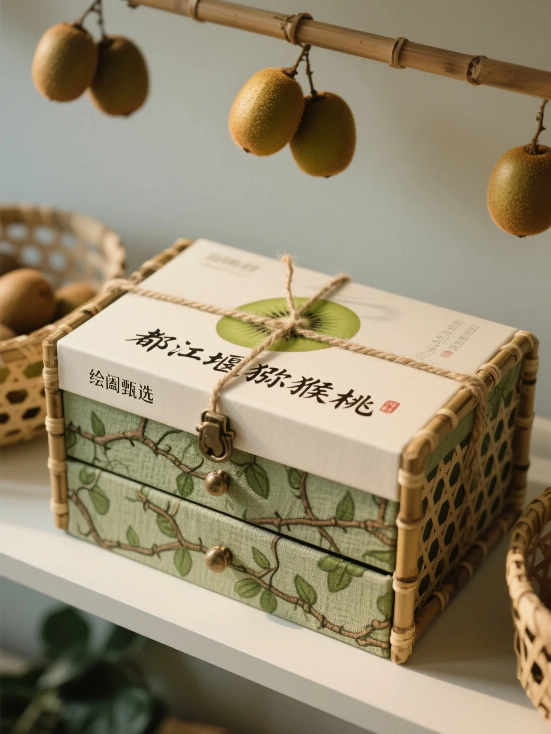 整体风格:走新中式自然风,竹编框架、布艺抽屉与麻绳捆扎结合,融入猕猴桃元素,将都江堰生态韵味与传统工艺相融,营造质朴雅致、贴近自然的氛围,凸显产品原生质感。包装形式:采用 “竹编外框 + 抽屉式内盒” 结构,兼具收纳与展示功能。分层设计实用且具仪式感,竹编材质传递自然温度,适配高端礼品与生态产品定位。色彩运用:以竹青、米白为主色调,搭配麻绳棕褐,色调柔和温润,呼应自然生态。借竹编质朴本色,传递都江堰猕猴桃天然、健康的属性,营造治愈视觉体验。图案设计:盒面绘猕猴桃切片,抽屉饰枝叶藤蔓,竹编镂空隐现自然纹理。将产品形态与生长元素融入,构建 “鲜果 + 生态” 视觉体系,强化产地特色联想。文字信息:突出 “都江堰猕猴桃”,“绘阖甄选” 作品牌背书,字体古朴。排版简洁,借传统文字风格呼应自然复古主题,清晰传递产地、品牌,加深品质认知。