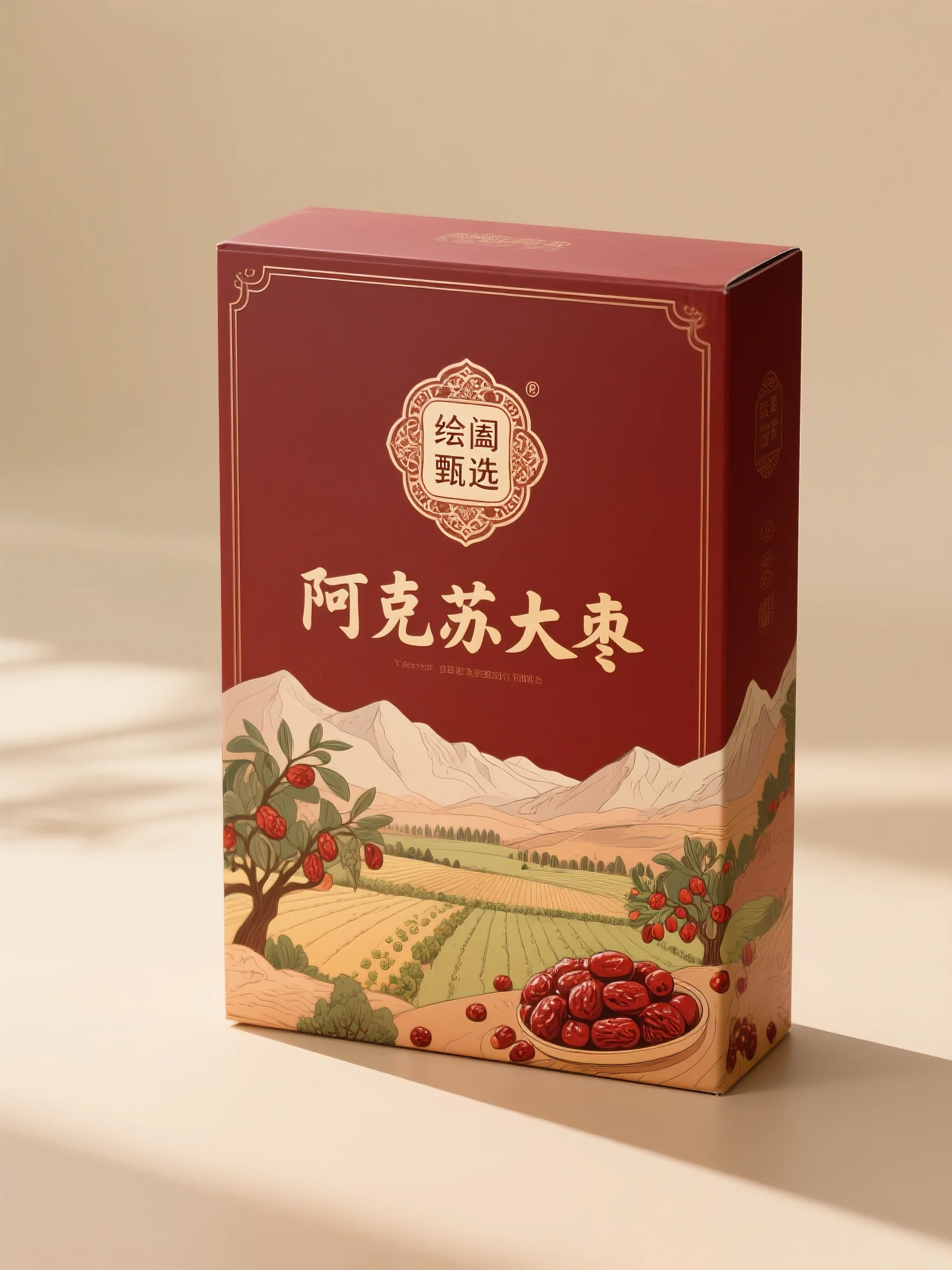 图案设计:手绘阿克苏山水、枣树与大枣实物,生动呈现产地环境与产品形态,强化“产地直供”的天然特质,插画风格细腻,深化地域文化关联,增强消费者情感共鸣与记忆点。