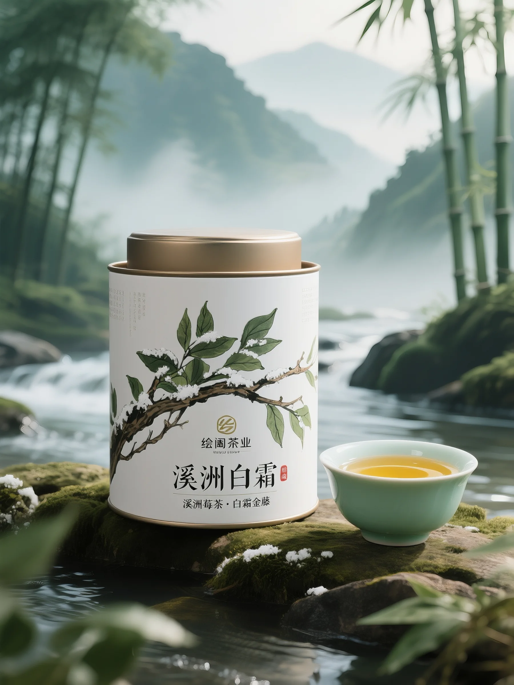 整体呈现:整体风格为新中式山水意境风,以自然山水为背景,茶罐与茶具融入其中,将茶文化与山水灵韵结合,营造出宁静、悠远、清雅的氛围,传递出产品源于自然、追求本真的格调,尽显东方美学的含蓄与深邃 。包装形式:采用圆柱形金属茶罐包装,罐体规整,金色罐盖提升质感,密封性好利于茶叶保鲜,简洁的形态适配日常品饮与礼品场景,实用且能彰显品质,展现品牌对产品储存与呈现的用心 。色彩运用:以白色为罐体主色,搭配金色罐盖、深褐枝干、翠绿叶片及背景自然色调,色彩简洁和谐,白色显纯净,金色添精致,自然色还原生态,营造出淡雅、清新又富有层次的视觉感受 。图案设计:罐身绘制带白霜的茶枝图案,枝干、叶片写实细腻,白霜增添独特质感,生动呈现 “溪洲白霜” 的产品特征,与背景山水呼应,传递出茶叶生长环境的天然与产品的独特性 。文字信息:“绘阖茶业” 标识品牌,“溪洲白霜”“溪洲莓茶・白霜金藤” 明确产品,字体古朴,布局规整,清晰传递核心信息,凸显产品的地域与品类属性,助力消费者识别与认知 。