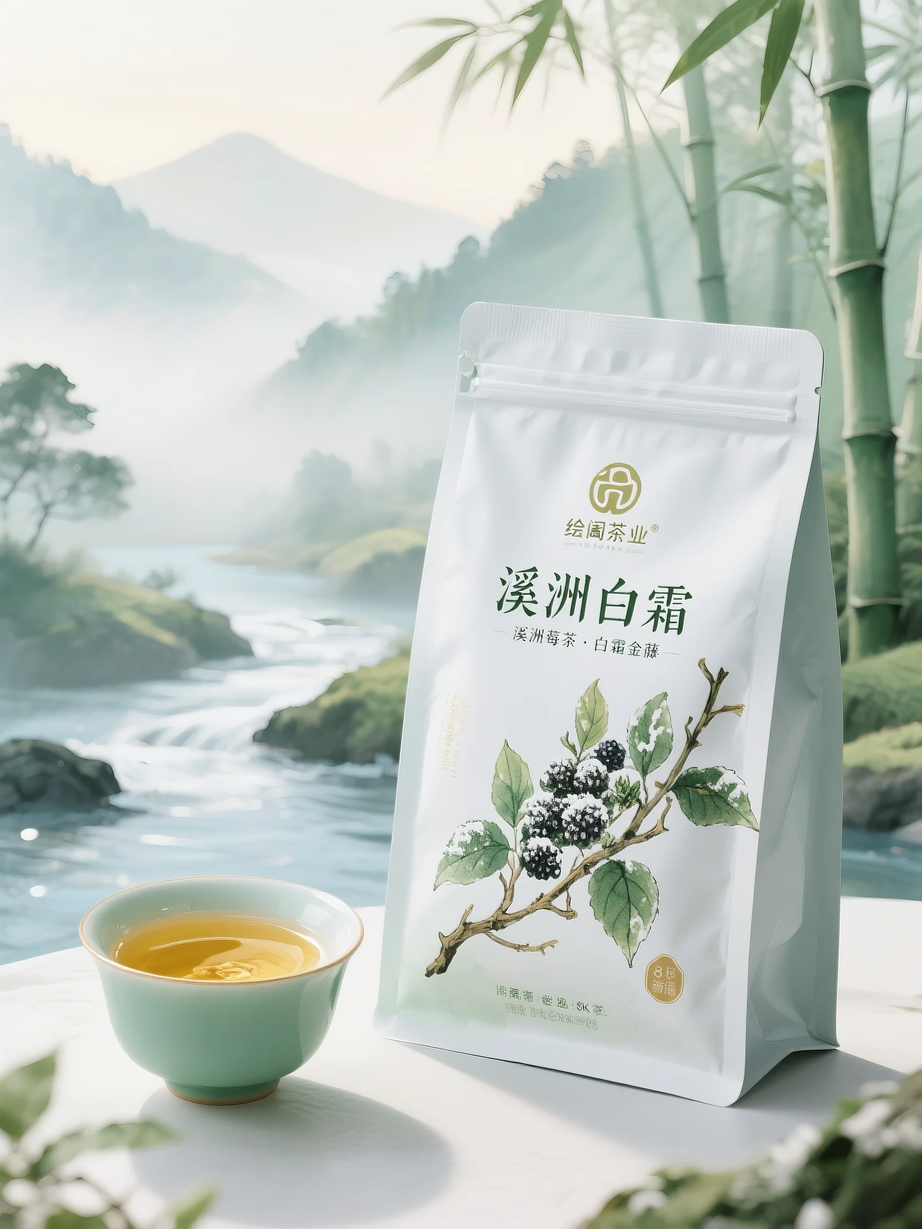 整体风格:整体风格为新中式山水风,以朦胧山水为背景,将茶袋、茶汤融入其中,把茶文化与自然景致相融合,营造出清幽、雅致、富有诗意的氛围,传递出产品自然本真的格调,尽显东方美学的含蓄韵味 。包装形式:采用自立自封袋包装,简约实用,便于储存、取用及防潮,白色袋身干净清爽,适配日常饮茶场景,兼顾功能性与美观性,展现出简洁大方的产品呈现方式 。色彩运用:以白色为袋身主色调,搭配绿色植物、黑色莓果及背景山水的自然色,色彩简洁清新,白色显纯净,自然色还原生态,营造出淡雅、质朴且富有生机的视觉感受 。图案设计:袋身绘制带白霜的莓茶枝图案,莓果、叶片写实细腻,白霜增添独特质感,生动呈现 “溪洲白霜” 的产品特征,与背景山水呼应,传递出茶叶生长环境的天然与产品独特性 。文字信息:“绘阖茶业” 标识品牌,“溪洲白霜”“溪洲莓茶・白霜金藤” 明确产品,字体简洁清晰,布局规整,清晰传递核心信息,助力消费者识别与了解产品 。