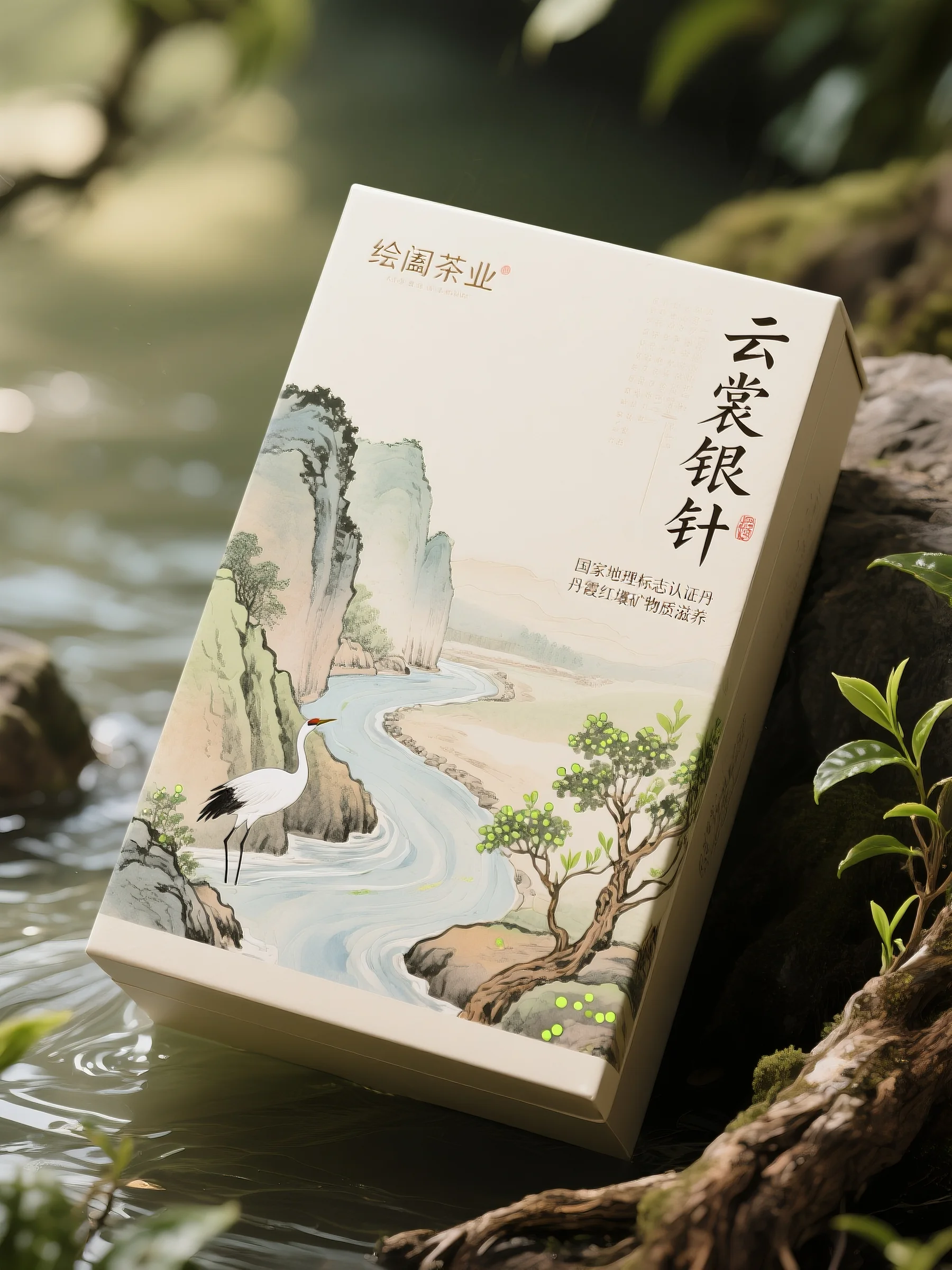 图案设计:盒面绘制传统山水图景,有山峦、溪流、仙鹤、树木,笔触细腻,意境悠远,生动呈现东方山水韵味,呼应 “云裳银针” 的诗意名称,赋予包装自然灵动感与文化内涵 。